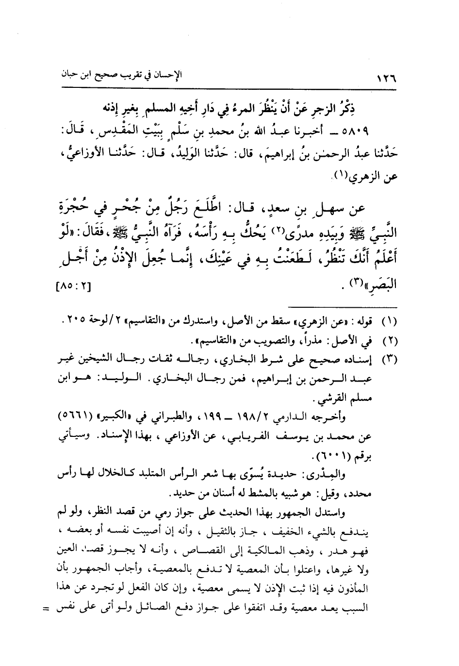 عَنْ سَهْلِ بْنِ سَعْدٍ، قَالَ: اطَّلَعَ رَجُلٌ مِنْ حُجْرٍ فِي حُجْرَةِ النَّبِيِّ صَلَّى اللَّهُ عَلَيْهِ وَسَلَّمَ وَبِيَدِهِ مِدْرًى2 يَحُكُّ بِهِ رَأْسَهُ، فَرَآهُ النَّبِيُّ صَلَّى اللَّهُ عَلَيْهِ وَسَلَّمَ، فَقَالَ: "لَوْ أَعْلَمُ أَنَّكَ تَنْظُرُ، لَطَعَنْتُ بِهِ فِي عَيْنِكَ، إِنَّمَا جُعِلَ الْإِذْنُ مِنْ أَجْلِ الْبَصَرِ" 3 [85:2]
