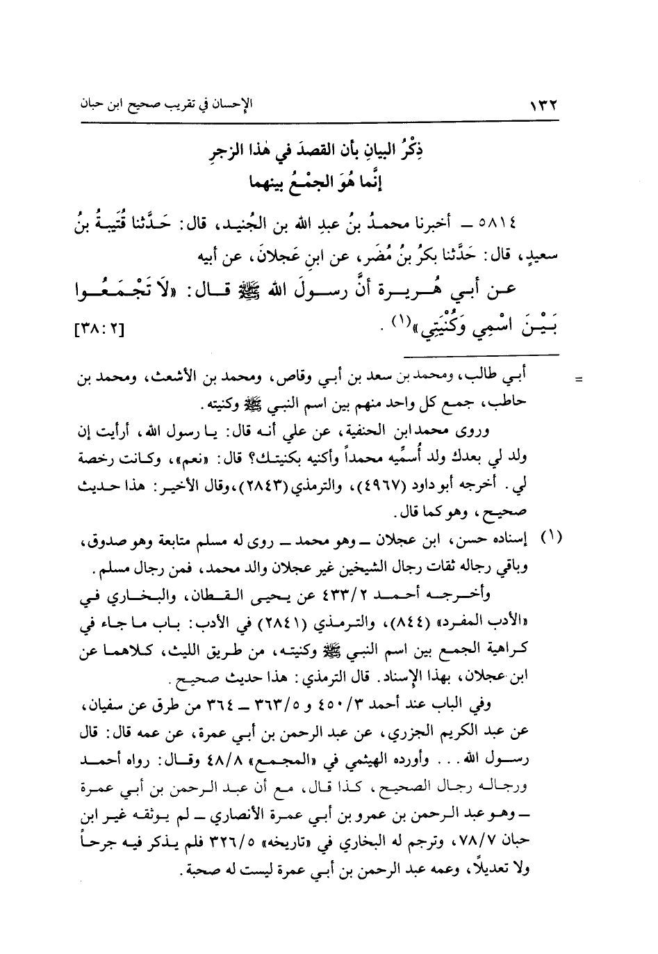 عَنْ أَبِي هُرَيْرَةَ أَنَّ رَسُولَ اللَّهِ صَلَّى اللَّهُ عَلَيْهِ وَسَلَّمَ قَالَ: "لَا تجمعوا بين اسمي وكنيتى" 1 [38:2]