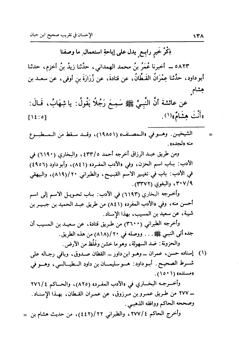 5823 ـ أَخْبَرَنَا عُمَرُ بْنُ مُحَمَّدٍ الْهَمْدَانِيُّ، حَدَّثَنَا زَيْدُ بْنُ أَخْزَمَ، حَدَّثَنَا أَبُو دَاوُدَ، حَدَّثَنَا عِمْرَانُ الْقَطَّانُ، عَنْ قَتَادَةَ عَنْ زُرَارَةَ بْنِ أَوْفَى، عَنْ سَعْدِ بْنِ هِشَامٍ عَنْ عَائِشَةَ أَنَّ النَّبِيَّ صَلَّى اللَّهُ عَلَيْهِ وَسَلَّمَ سَمِعَ رَجُلًا يَقُولُ: يَا شِهَابُ، قَالَ: "أَنْتَ هشام" 1 [14:5]