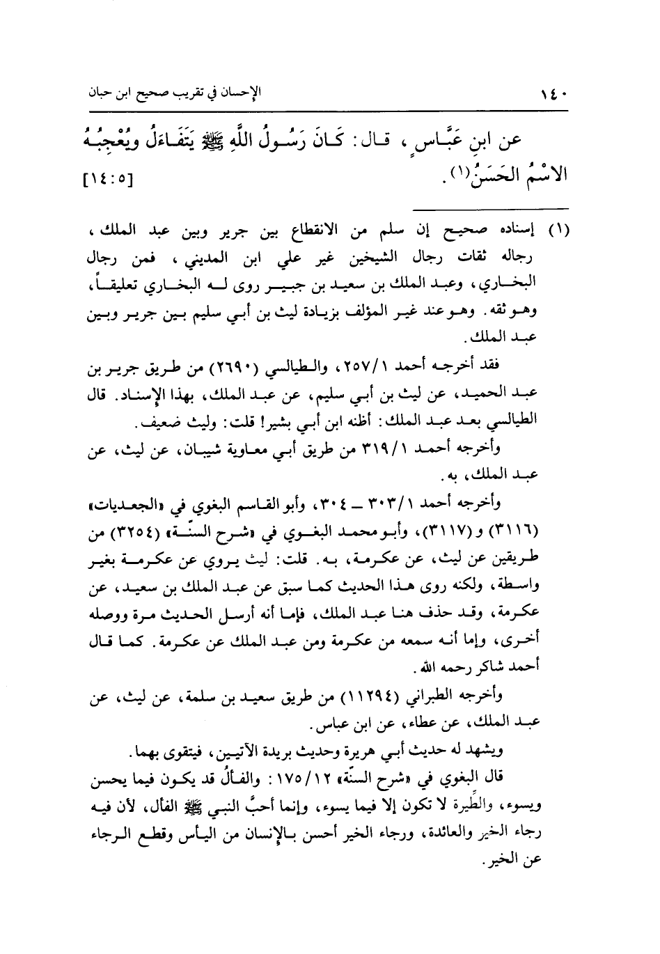 عن بن عَبَّاسٍ، قَالَ: كَانَ رَسُولُ اللَّهِ صَلَّى اللَّهُ عَلَيْهِ وسلم يتفاءل ويعجبه الاسم الحسن1 [14:5]