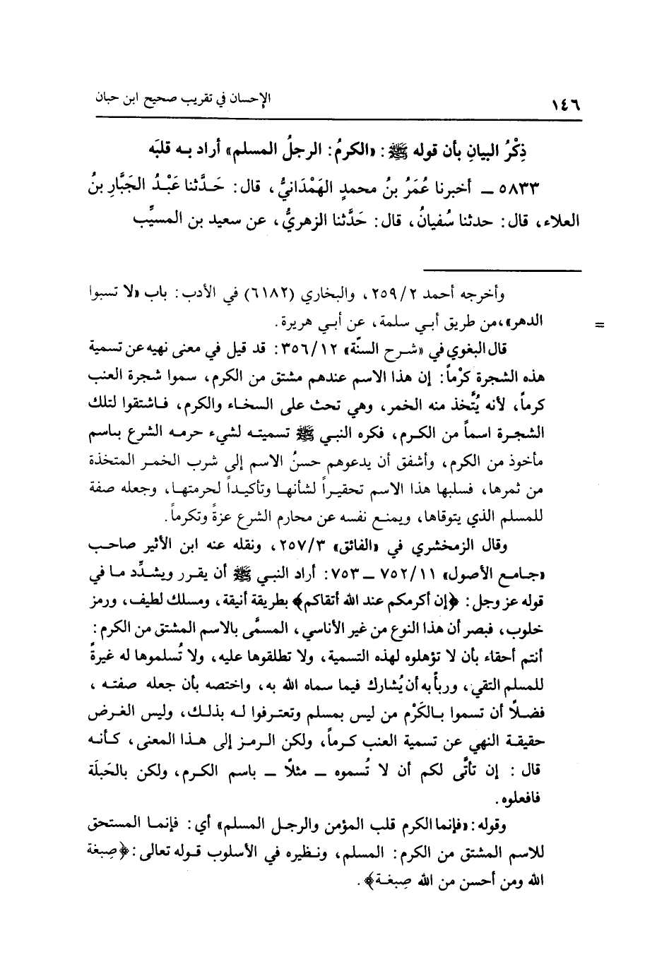 وقال الزمخشري في "الفائق" 3/257، ونقله عنه ابن الأثير صاحب "جامع الأصول" 11/752 ـ 753،: أرد النبي صلى الله عليه وسلم أن يقرر ويشدِّد ما في قوله عز وجل: {إِنَّ أَكْرَمَكُمْ عِنْدَ اللَّهِ أَتْقَاكُمْ} بطريقة أنيقة، ومسلك لطيف، ورمز خلوب، فبصر أن هذا النوع من غير الأناسي، المسمى بالاسم المشتق من الكرم: أنتم أحقاء بأن لا تؤهلوه لهذه التسمية، ولا تطلقوها عليه، ولا تسلموها له غيرةً للمسلم التقي، وربأ به أن يشارك فيما سماه الله به، واختصه بأن جعله صفته، فضلاً أن تسموا بالكرم من ليس بمسلم وتعترفوا له بذلك، وليس الغرض حقيقة النهي عن تسمية العنب كرماً، ولكن الرمز إلى هذا المعنى، كأنه قال: إن تأتَّي لكم أن لا تسموه ـ مثلا ـ باسم الكرم، ولكن بالحبلة فافعلوه.