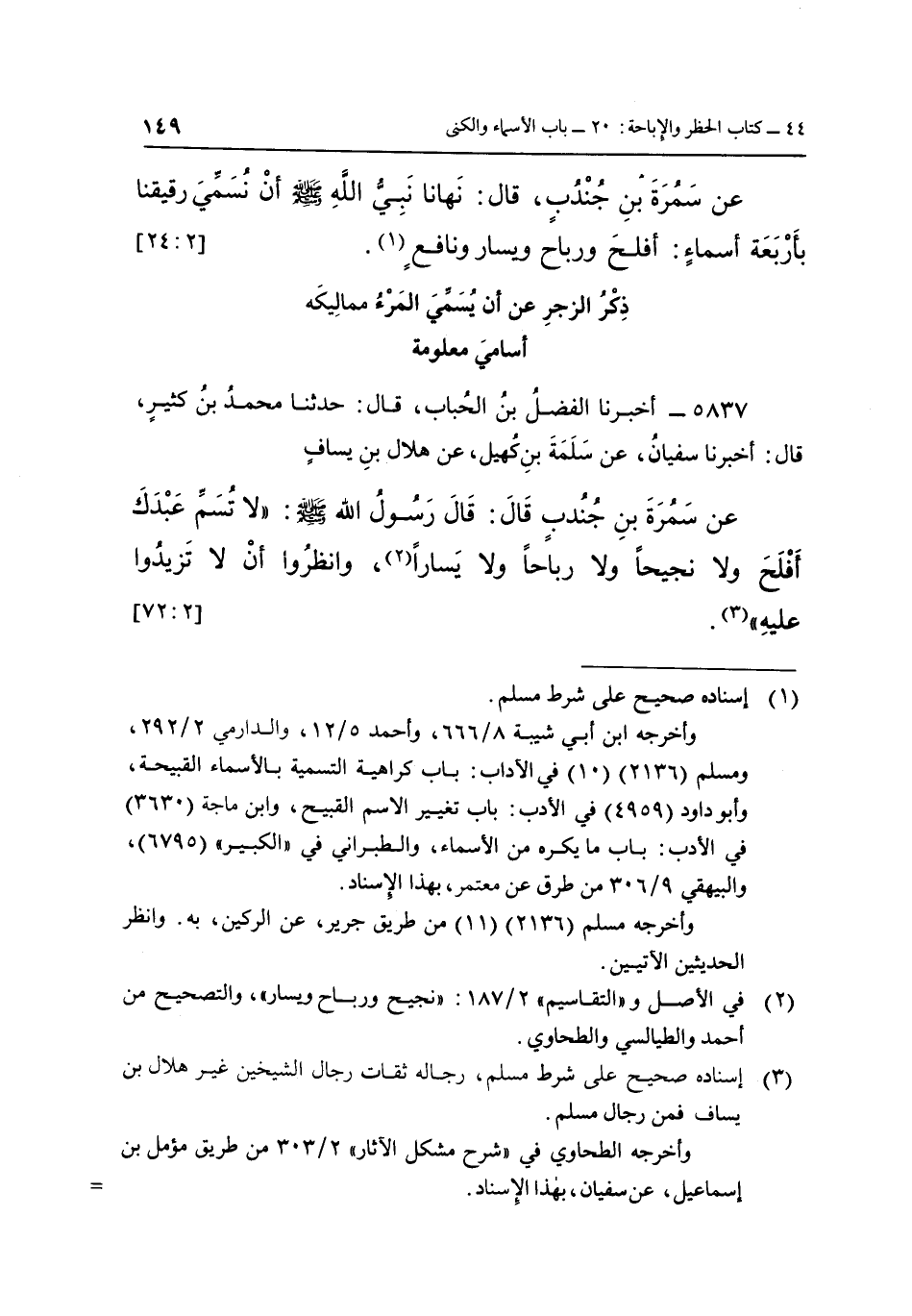 عَنْ سَمُرَةَ بْنِ جُنْدُبٍ قَالَ: قَالَ رَسُولُ اللَّهِ صَلَّى اللَّهُ عَلَيْهِ وَسَلَّمَ: "لَا تُسَمِّ عَبْدَكَ أَفْلَحَ وَلَا نَجِيحًا وَلَا رَبَاحًا وَلَا يَسَارًا2، وَانْظُرُوا أَنْ لَا تَزِيدُوا عَلَيْهِ" 3 [72:2]