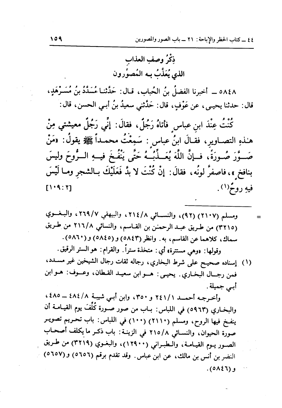 كنت عند بن عَبَّاسٍ فَأَتَاهُ رَجُلٌ، فَقَالَ: "إِنِّي رَجُلٌ مَعِيشَتِي من هذه التصاوير، فقال بن عَبَّاسٍ: سَمِعْتُ مُحَمَّدًا صَلَّى اللَّهُ عَلَيْهِ وَسَلَّمَ يَقُولُ: "مَنْ صَوَّرَ صُورَةٍ، فَإِنَّ اللَّهَ يُعَذِّبُهُ حتى ينفخ فيه الروح وليس نافخ" فاصفر لونه، فقال: إن كنت لا بد فعليك بالشجر وما ليس فيه روح1 [109:2]