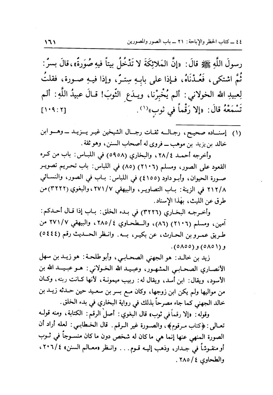 رسول الله صلى الله عليه وسلم قال: "إن الملائكة لا تدخل بيتا فيه صورة" قَالَ بُسْرٌ ثُمَّ اشْتَكَى، فَعُدْنَاهُ، فَإِذَا عَلَى بَابِهِ سِتْرٌ، وَإِذَا فِيهِ صُورَةٌ، فَقُلْتُ لِعُبَيْدِ اللَّهِ الْخَوْلَانِيِّ: أَلَمْ يُخْبِرْنَا، وَيَدَعُ الثَّوْبَ! قَالَ عُبَيْدُ اللَّهِ: أَلَمْ تَسْمَعْهُ قَالَ: "إِلَّا رَقْمًا في ثوب" 1 [109:2]