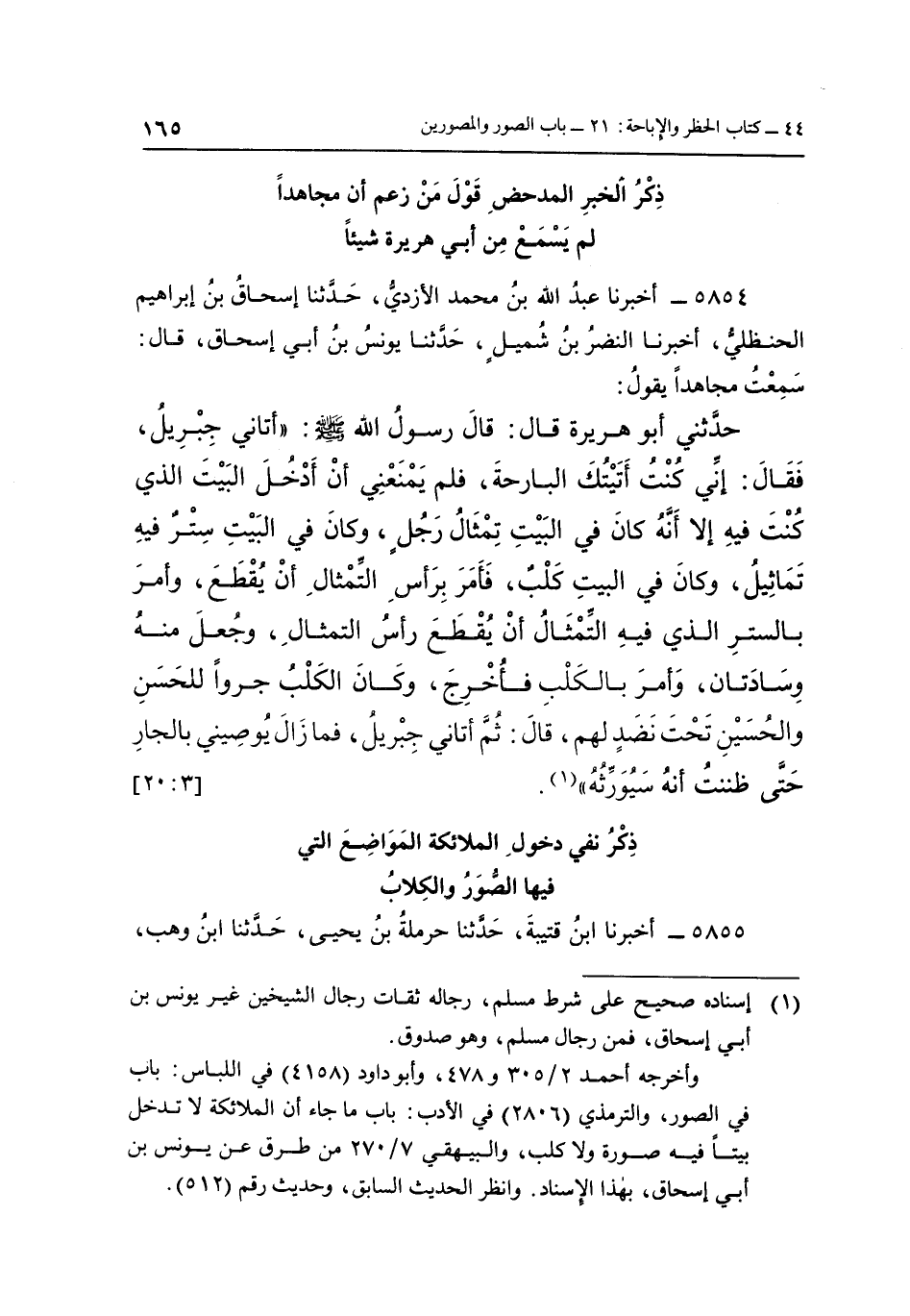 حَدَّثَنِي أَبُو هُرَيْرَةَ قَالَ: قَالَ رَسُولُ اللَّهِ صَلَّى اللَّهُ عليه وسلم: "أَتَانِي جِبْرِيلُ، فَقَالَ: إِنِّي كُنْتُ أَتَيْتُكَ الْبَارِحَةَ، فَلَمْ يَمْنَعْنِي أَنْ أَدْخُلَ الْبَيْتَ الَّذِي كُنْتَ فِيهِ إِلَّا أَنَّهُ كَانَ فِي الْبَيْتِ تِمْثَالُ رَجُلٍ وَكَانَ فِي الْبَيْتِ سِتْرٌ فِيهِ تَمَاثِيلُ, وَكَانَ فِي الْبَيْتِ كَلْبٌ فَأَمَرَ بِرَأْسِ التِّمْثَالِ ان يقطع وامر بالسترالذي فيه تمثال أَنْ يُقْطَعَ رَأْسُ التِّمْثَالِ, وَجُعِلَ مِنْهُ وِسَادَتانِ وَأَمَرَ بِالْكَلْبِ فَأُخْرِجَ وَكَانَ الْكَلْبُ جَرْوًا لِلْحَسَنِ وَالْحُسَيْنِ تَحْتَ نَضَدٍ لَهُمْ قَالَ ثُمَّ أَتَانِي جِبْرِيلُ فَمَا زَالَ يُوصِينِي بِالْجَارِ حَتَّى ظَنَنْتُ انه سيورثه"1 [20:3]