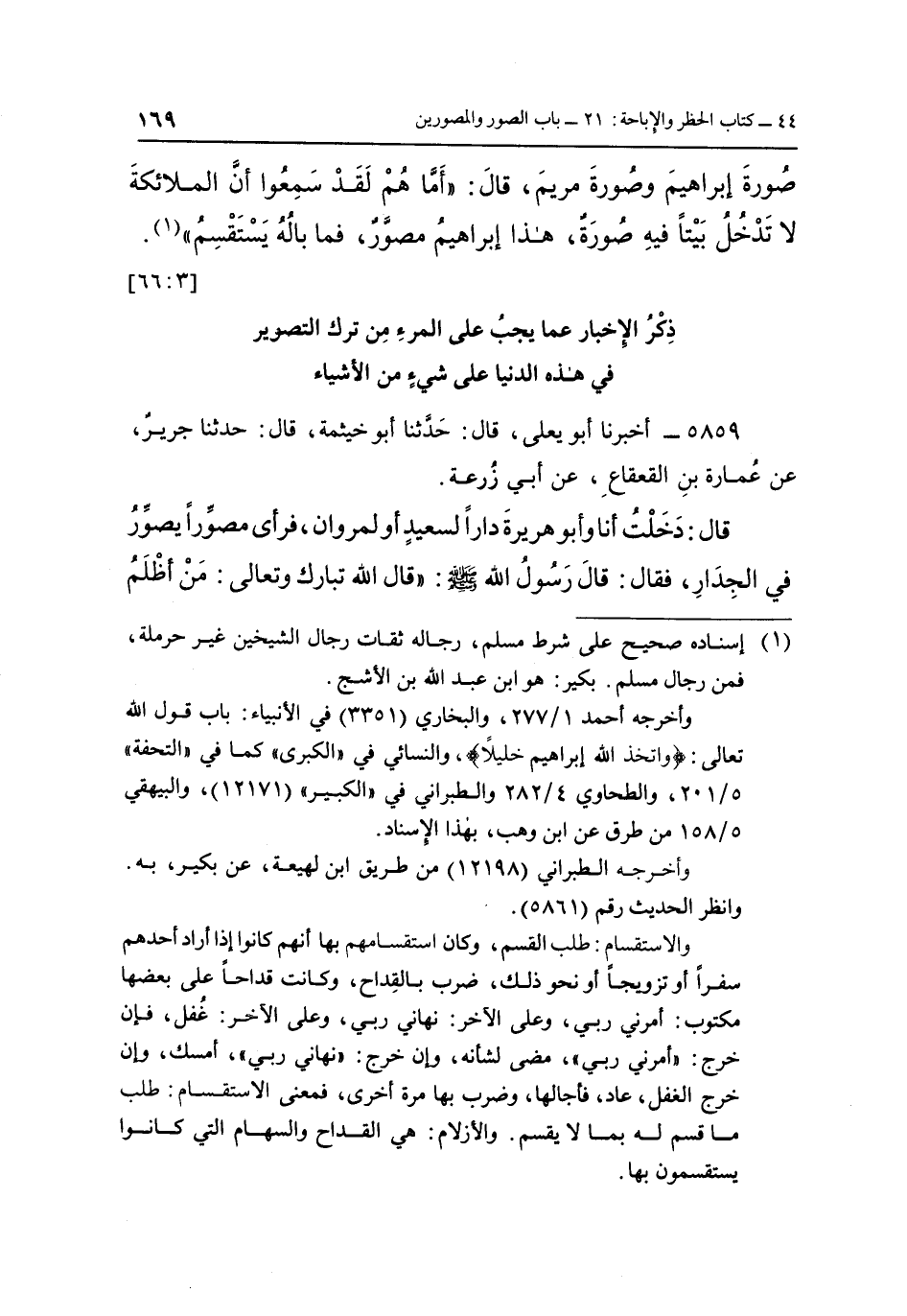 صُورَةَ إِبْرَاهِيمَ وَصُورَةَ مَرْيَمَ، قَالَ: "أَمَّا هُمْ لَقَدْ سَمِعُوا أَنَّ الْمَلَائِكَةَ لَا تَدْخُلُ بَيْتًا فِيهِ صُورَةٌ، هَذَا إِبْرَاهِيمُ مُصَوِّرٌ، فَمَا بَالُهُ يستقسم" 1 [66:3]