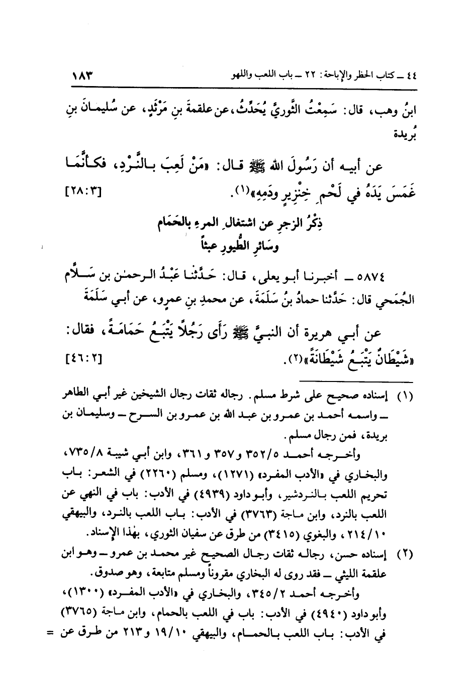 عَنْ أَبِي هُرَيْرَةَ أَنَّ النَّبِيَّ صَلَّى اللَّهُ عَلَيْهِ وَسَلَّمَ رَأَى رَجُلًا يتبع حمامة، فقال: " شيطان يتبع شيطانه" 2 [46:2]