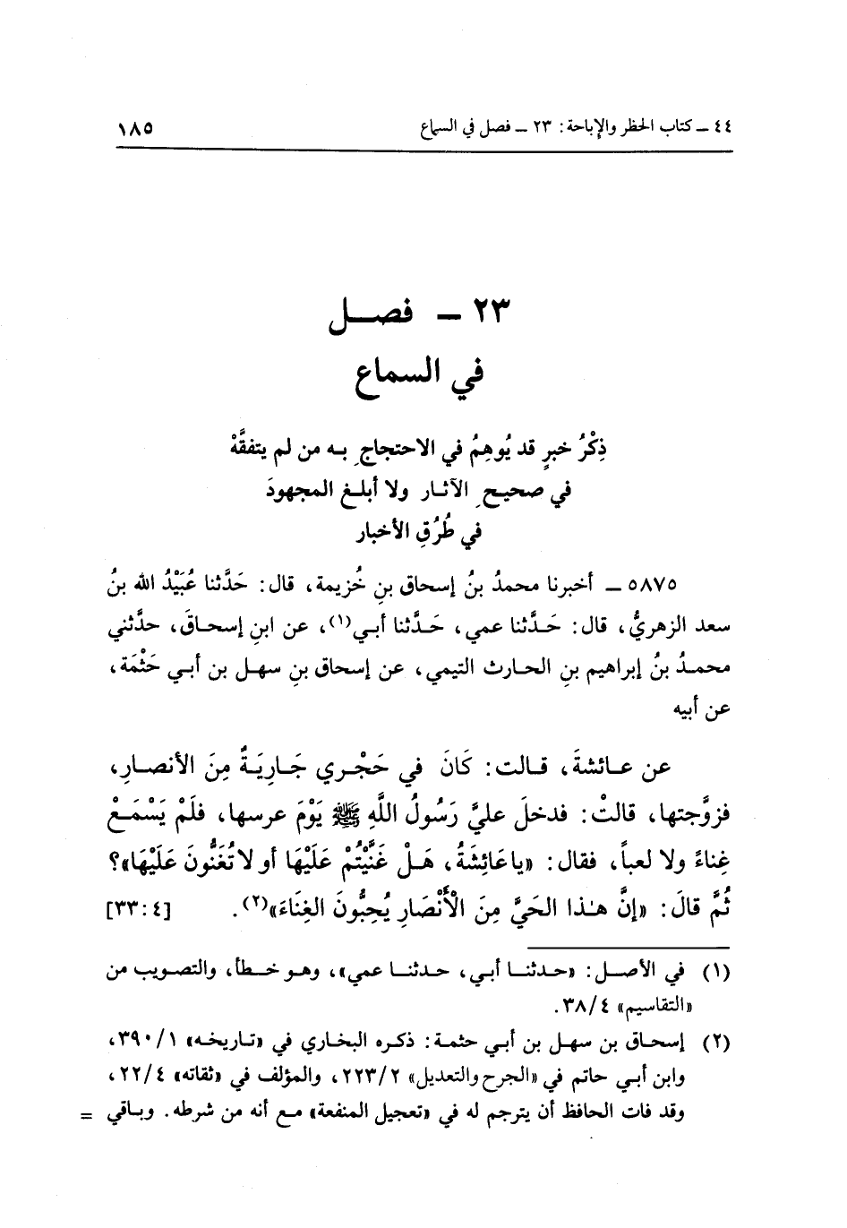 عَنْ عَائِشَةَ، قَالَتْ: كَانَ فِي حِجْرِي جَارِيَةٌ مِنَ الْأَنْصَارِ، فَزَوَّجْتُهَا، قَالَتْ فَدَخَلَ عَلَى رَسُولِ اللَّهِ صَلَّى اللَّهُ عَلَيْهِ وَسَلَّمَ يَوْمَ عُرْسِهَا، فَلَمْ يَسْمَعْ غِنَاءً وَلَا لَعِبًا، فَقَالَ: "يَا عَائِشَةُ هَلْ غَنَّيْتُمْ عَلَيْهَا أَوَ لَا تُغَنُّونَ عَلَيْهَا"؟ ثُمَّ قَالَ: "إِنَّ هذا الحي من الأنصار يحبون الغناء" 2 [33:4]