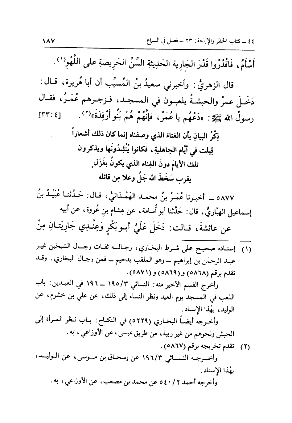 قَالَ الزُّهْرِيُّ: وَأَخْبَرَنِي سَعِيدُ بْنُ الْمُسَيِّبِ أَنَّ أَبَا هُرَيْرَةَ، قَالَ دَخَلَ عُمَرُ وَالْحَبَشَةُ يَلْعَبُونَ فِي الْمَسْجِدِ، فَزَجَرَهُمْ عُمَرُ، فَقَالَ رَسُولُ اللَّهِ صَلَّى اللَّهُ عَلَيْهِ وَسَلَّمَ: "دَعْهُمْ يَا عُمَرُ فإنهم هم بنو أرفدة" 2 [33:4]