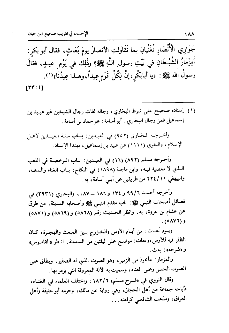 جَوَارِي الْأَنْصَارِ تُغَنِّيَانِ بِمَا تَقَاوَلَتِ الْأَنْصَارُ يَوْمَ بُعَاثٍ، فَقَالَ أَبُو بَكْرٍ: أَمِزْمَارُ الشَّيْطَانِ فِي بَيْتِ رَسُولِ اللَّهِ صَلَّى اللَّهُ عَلَيْهِ وَسَلَّمَ؟ وَذَلِكَ فِي يَوْمِ عِيدٍ، فَقَالَ رَسُولُ اللَّهِ صَلَّى اللَّهُ عَلَيْهِ وَسَلَّمَ: "يَا أَبَا بَكْرٍ إن لكل قوم عيدا وهذا عيدنا" 1 [33:4]