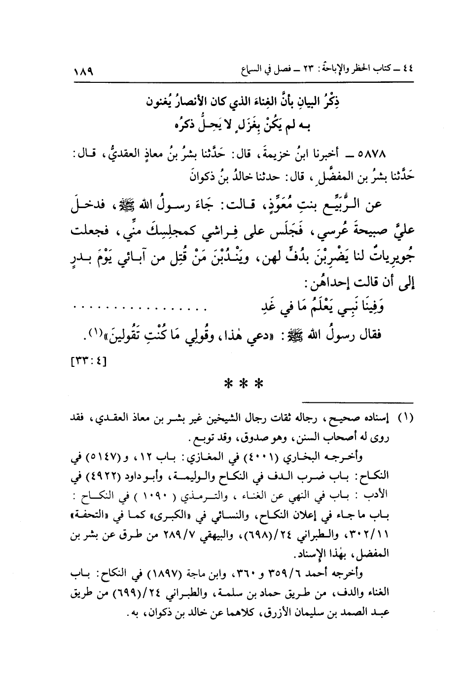 عَنِ الرُّبَيِّعِ بِنْتِ مُعَوِّذِ، قَالَتْ: جَاءَ رَسُولُ اللَّهِ صَلَّى اللَّهُ عَلَيْهِ وَسَلَّمَ، فَدَخَلَ عَلَيَّ صَبِيحَةَ عُرْسِي، فَجَلَسَ عَلَى فِرَاشِي كَمَجْلِسِكَ مِنِّي، فَجَعَلَتْ جُوَيْرِيَاتٌ لَنَا يَضْرِبْنَ بِدُفٍّ لَهُنَّ، وَيَنْدُبْنَ مَنْ قُتِلَ مِنْ آبَائِي يَوْمَ بَدْرٍ إِلَى أَنْ قَالَتْ إِحْدَاهُنَّ: