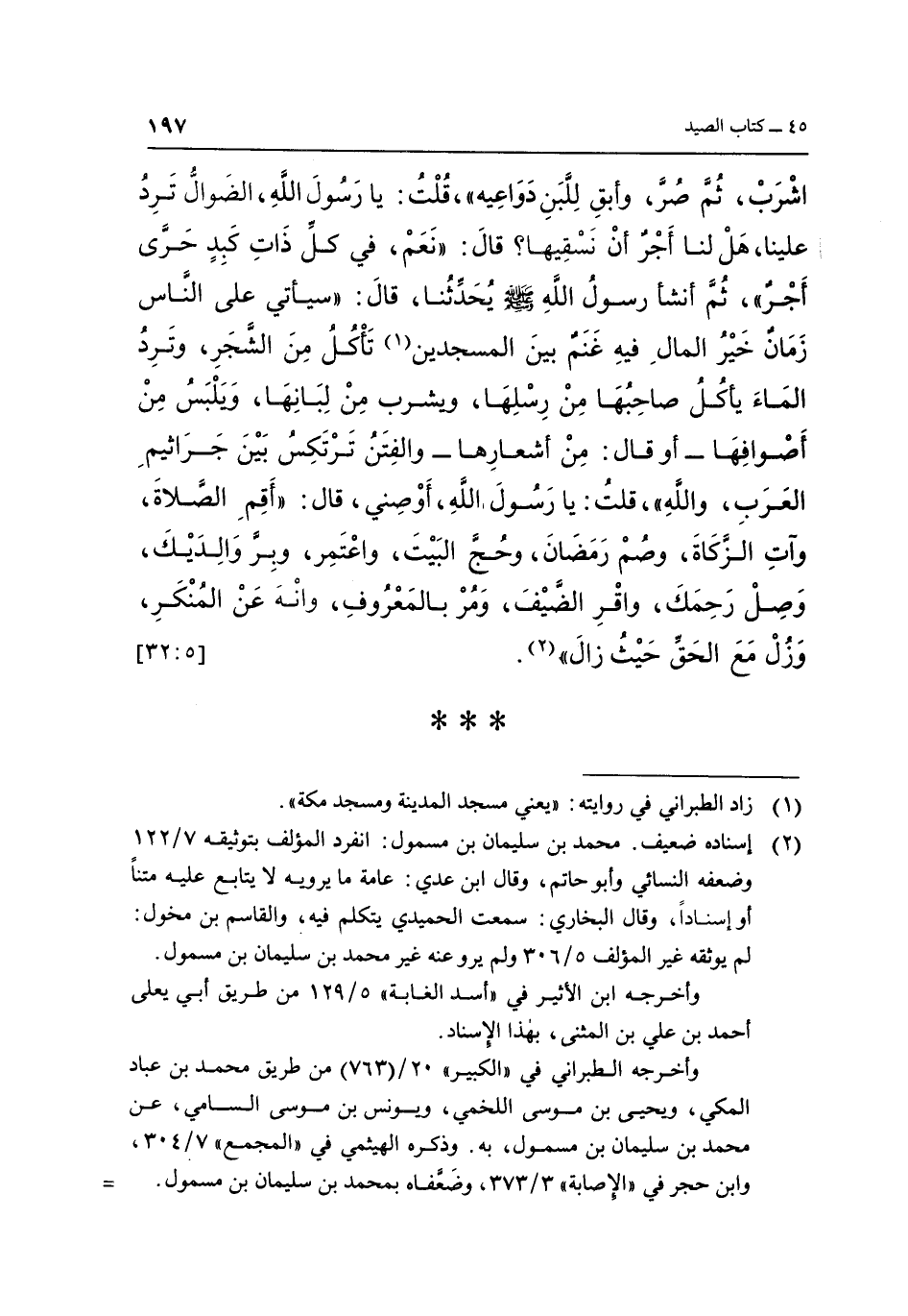 اشْرَبْ، ثُمَّ صُرَّ، وَأَبْقِ لِلَّبَنِ دَوَاعِيَهُ"، قُلْتُ: يَا رَسُولَ اللَّهِ الضَّوَالُّ تَرِدُ عَلَيْنَا، هَلْ لَنَا أَجْرٌ أَنْ نَسْقِيَهَا؟ قَالَ: "نَعَمْ، فِي كُلِّ ذَاتِ كَبِدٍ حَرَّى أَجْرٌ"، ثُمَّ أَنْشَأَ رَسُولُ اللَّهِ صَلَّى اللَّهُ عَلَيْهِ وَسَلَّمَ يُحَدِّثُنَا، قَالَ: "سَيَأْتِي عَلَى النَّاسِ زَمَانٌ خَيْرُ الْمَالِ فِيهِ غَنَمٌ بَيْنَ الْمَسْجِدَيْنِ1 تَأْكُلُ مِنَ الشَّجَرِ، وَتَرِدُ الْمَاءَ يَأْكُلُ صَاحِبُهَا مِنْ رِسْلِهَا، وَيَشْرَبُ مِنْ لِبَانِهَا، وَيَلْبسُ مِنْ أَصْوَافَهَا ـ أَوْ قَالَ: مِنَ أَشْعَارِهَا ـ وَالْفِتَنُ تَرْتَكِسُ بَيْنَ جَرَاثِيمِ الْعَرَبِ، وَاللَّهِ" قُلْتُ: يَا رَسُولَ اللَّهِ، أَوْصِنِي، قَالَ: "أَقِمِ الصَّلَاةَ، وَآتِ الزَّكَاةَ، وَصُمْ رَمَضَانَ، وَحُجَّ الْبَيْتَ وَاعْتَمِرْ، وَبِرَّ وَالِدَيْكَ، وَصِلْ رَحِمَكَ، وَاقْرِ الضَّيْفَ، وَمُرْ بِالْمَعْرُوفِ، وَانْهَ عَنِ الْمُنْكَرِ، وَزُلْ مع الحق حيث زال" 2 [32:5]