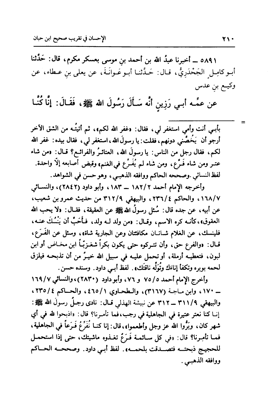 وأخرجه الإمام أحمد 5/75و76، وأبو داود "283"، والنسائي 7/169 – 170، وابن ماجة "3167"، والطحاوي 1/465،والحاكم 4/235، والبيهقي 9/311 – 312 عن نشبية الهذلي قال: نادى رجل رسول الله صلى الله عليه وسلم: إنا كنا نعتر عتيرة في الجاهلية في رجب، فما تأمرنا؟ قال: "اذبحوا لله في أي شهر كان، وبروا الله عز وجل وأطعموا" قال: إنا كنا نفرع فرعاً في الجاهلية، فما تأمرنا؟ قال: "في كل سائمة فرع تغذوه ما شيتك، حتى إذا اسحمل للحجيج ذبحته فتصدقت بلحمه".لفظ أبي داود. وصححه الحاكم ووافقه الذهبي.