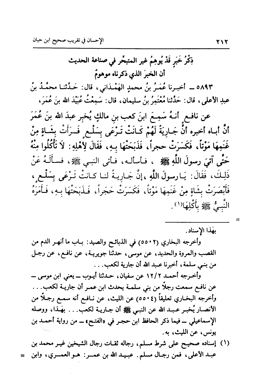 وأخرجه البخاري تعليقا "5504" عن الليث، عن نافع أنه سمع رجلاً من الأنصار يخبر عَبْدِ اللَّهِ عَنِ النَّبِيِّ صَلَّى اللَّهُ عَلَيْهِ وَسَلَّمَ أَنَّ جارية لكعب ... بهذا, ووصله الإسماعيلي – فيما ذكر الحافظ ابن حجر في "الفتح" – من رواية أحمد بن يونس، عن الليث، به.