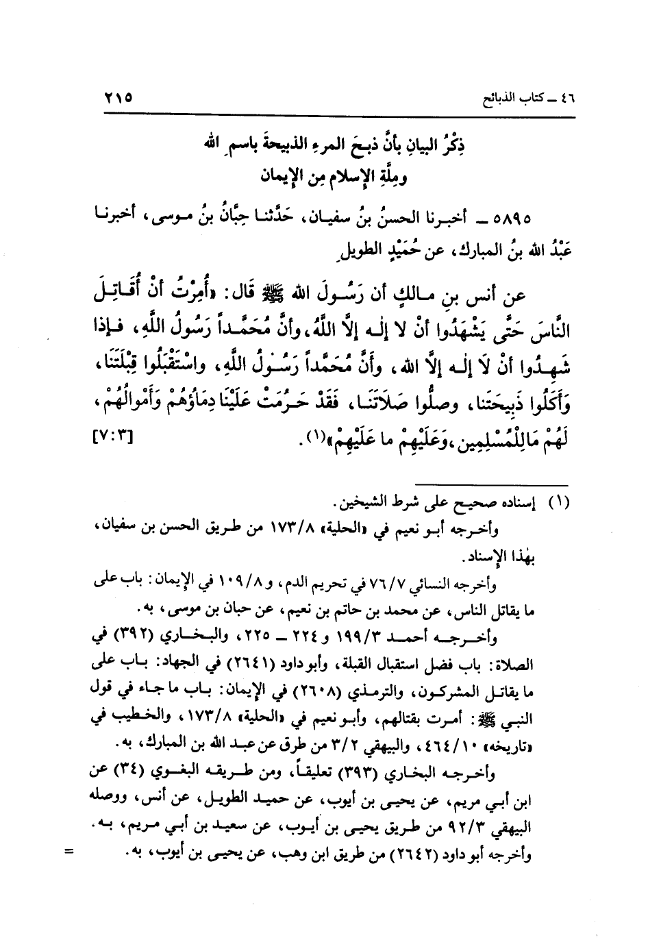 وأخرجه أحمد 3/199و224 – 225، والبخاري "392" في الصلاة: باب فضل استقبال القبلة، وأبو داود "2641" في الجهاد: باب على ما يقاتل المشركون، والترمذي "2608" في الإيمان: باب ما جاء في قول النبي صلى الله عليه وسلم: أمرت بقتالهم، وأبو نعيم في "الحلية" 8/173، والخطيب في "تاريخه" 10/464، والبيهقي 2/3 من طرق عن عبد الله بن المبارك، به.