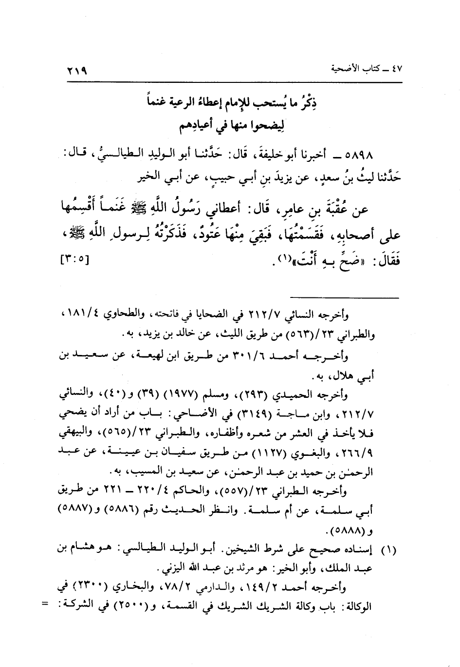 عَنْ عُقْبَةَ بْنِ عَامِرٍ قَالَ: أَعْطَانِي رَسُولُ اللَّهِ صَلَّى اللَّهُ عَلَيْهِ وَسَلَّمَ غَنَمًا أَقْسِمُهَا عَلَى أَصْحَابِهِ، فَقَسَمْتُهَا، فَبَقِيَ مِنْهَا عَتُودٌ، فَذَكَرْتُهُ لِرَسُولِ اللَّهِ صَلَّى اللَّهُ عَلَيْهِ وَسَلَّمَ، فقَالَ: "ضَحِّ بِهِ أَنْتَ" 1 [3:5]
