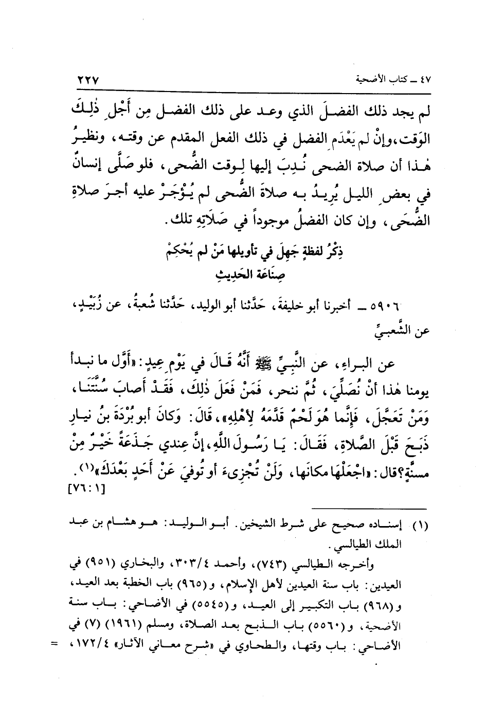 5906 ـ أَخْبَرَنَا أَبُو خَلِيفَةَ حَدَّثَنَا أَبُو الْوَلِيدِ، حَدَّثَنَا شُعْبَةُ عَنْ زُبَيْدٍ، عَنِ الشَّعْبِيِّ عَنِ الْبَرَاءِ، عَنِ النَّبِيِّ صَلَّى اللَّهُ عَلَيْهِ وَسَلَّمَ أَنَّهُ قَالَ فِي يَوْمِ عِيدٍ: "أَوَّلُ مَا نَبْدَأُ يَوْمَنَا هَذَا أَنْ نُصَلِّيَ، ثُمَّ نَنْحَرَ، فَمَنْ فَعَلَ ذَلِكَ، فَقَدْ أَصَابَ سُنَّتَنَا، وَمَنْ تَعَجَّلَ، فَإِنَّمَا هُوَ لَحْمٌ قَدَّمَهُ لِأَهْلِهِ"، قَالَ: وَكَانَ أَبُو بُرْدَةَ بْنُ نِيَارٍ ذَبَحَ قَبْلَ الصَّلَاةِ، فَقَالَ: يَا رَسُولَ اللَّهِ، ان عندي جذعة خير من سنة؟ قَالَ: "اجْعَلْهَا مَكَانَهَا، وَلَنْ تُجْزِئَ أَوْ تُوُفِّيَ عن أحد بعدك" 1 [76:1]