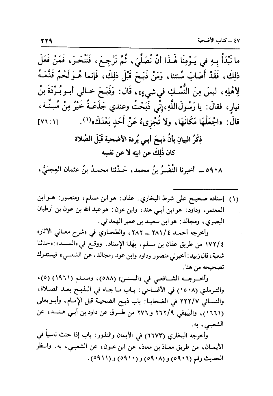 وأخرجه الشافعي في "السنن" "588"، ومسلم "1961" "5"، والترمذي "1508" في الأضاحي: باب ما جاء في الذبح بعد الصلاة، والنسائي 7/222 في الضحايا: باب ذبح الضحية قبل الإمام، وأبو يعلى "1661"، والبيهقي 9/262و276 من طرق عن داود بن أبي هند، عن الشعبي، به.