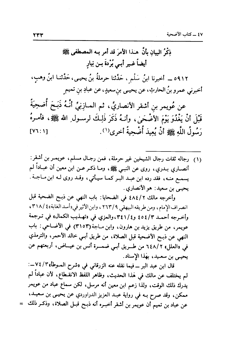 عَنْ عُوَيْمِرِ بْنِ أَشْقَرَ الْأَنْصَارِيِّ، ثُمَّ الْمَازِنِيِّ أَنَّهُ ذَبَحَ أُضْحِيَّةً قَبْلَ أَنْ يغدوا يَوْمَ الْأَضْحَى، وَأَنَّهُ ذَكَرَ ذَلِكَ لِرَسُولِ اللَّهِ صَلَّى اللَّهُ عَلَيْهِ وَسَلَّمَ، فَأَمَرَهُ رَسُولُ اللَّهِ صَلَّى اللَّهُ عَلَيْهِ وَسَلَّمَ أَنْ يُعِيدَ أُضْحِيَّةً أخرى1 [76:1]