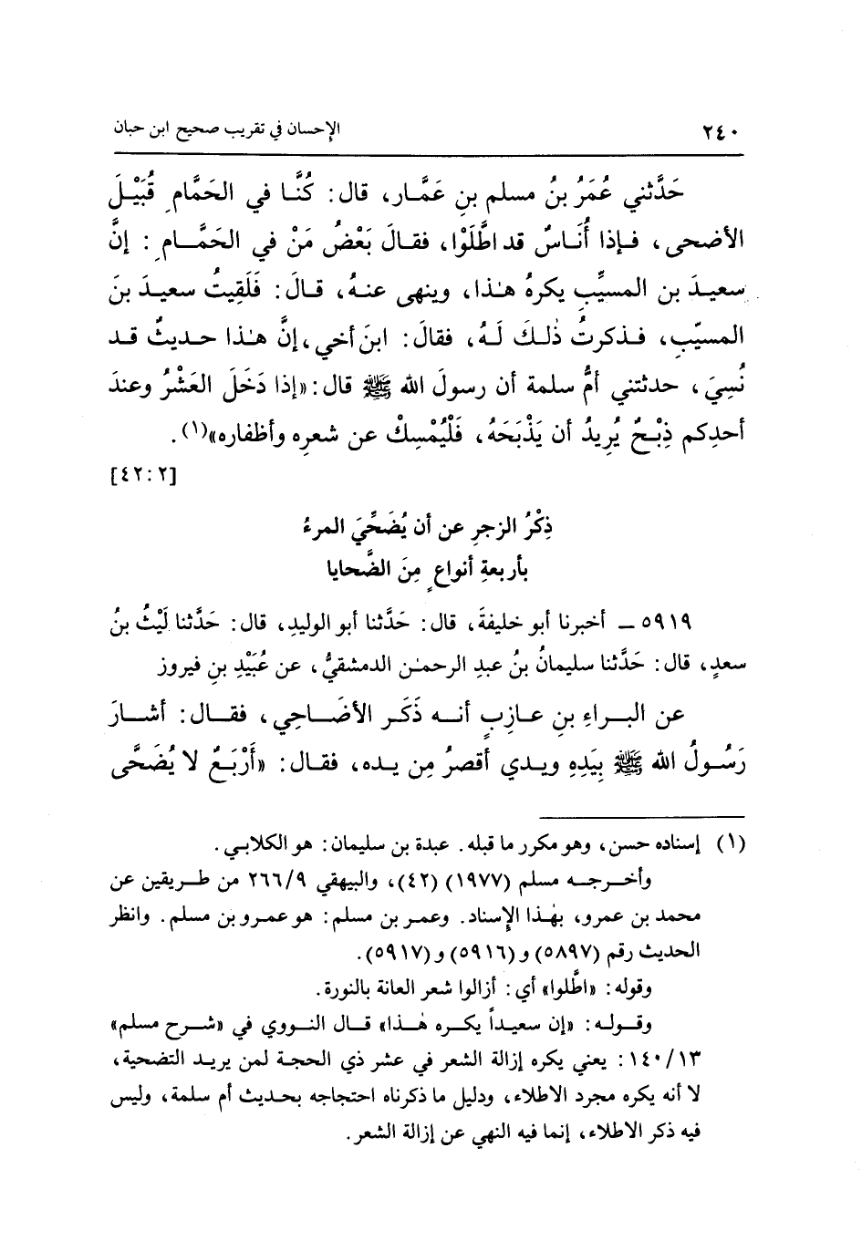 حَدَّثَنِي عُمَرُ، بْنُ مُسْلِمِ بْنِ عَمَّارٍ، قَالَ: كُنَّا فِي الْحَمَّامِ قُبَيْلَ الْأَضْحَى، فَإِذَا أُنَاسٌ قَدِ اطَّلَوْا، فَقَالَ بَعْضُ مَنْ فِي الْحَمَّامِ: إِنَّ سَعِيدَ بْنَ الْمُسَيِّبِ يَكْرَهُ هَذَا، وَيَنْهَى عَنْهُ، قَالَ: فَلَقِيتُ سَعِيدَ بْنَ الْمُسَيِّبِ، فَذَكَرْتُ ذلك له، فقال: بن أَخِي، إِنَّ هَذَا حَدِيثٌ قَدْ نُسِيَ حَدَّثَتْنِي أُمِّ سَلَمَةَ أَنَّ رَسُولَ اللَّهِ صَلَّى اللَّهُ عَلَيْهِ وَسَلَّمَ قَالَ: "إِذَا دَخَلَ الْعَشْرُ وَعِنْدَ أَحَدِكُمْ ذِبْحٌ يُرِيدُ أَنْ يَذْبَحَهُ، فَلْيُمْسِكْ عَنْ شعره وأظفاره" 1 [42:2]
