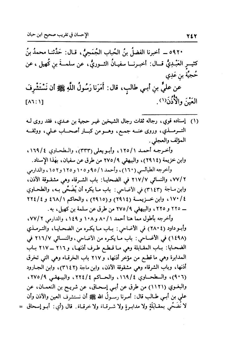 5920 ـ أَخْبَرَنَا الْفَضْلُ بْنُ الْحُبَابِ الْجُمَحِيُّ، قَالَ: حَدَّثَنَا مُحَمَّدُ بْنُ كَثِيرٍ الْعَبْدِيُّ قَالَ: أَخْبَرَنَا سُفْيَانُ الثَّوْرِيُّ، عَنْ سَلَمَةَ بْنِ كُهَيْلٍ، عَنْ حُجَيَّةَ بْنِ عَدِيٍّ عَنْ عَلِيِّ بْنِ أَبِي طَالِبٍ، قَالَ: أَمَرَنَا رَسُولُ اللَّهِ صَلَّى اللَّهُ عَلَيْهِ وَسَلَّمَ أن نستشرف العين والاذن1 [86:1]