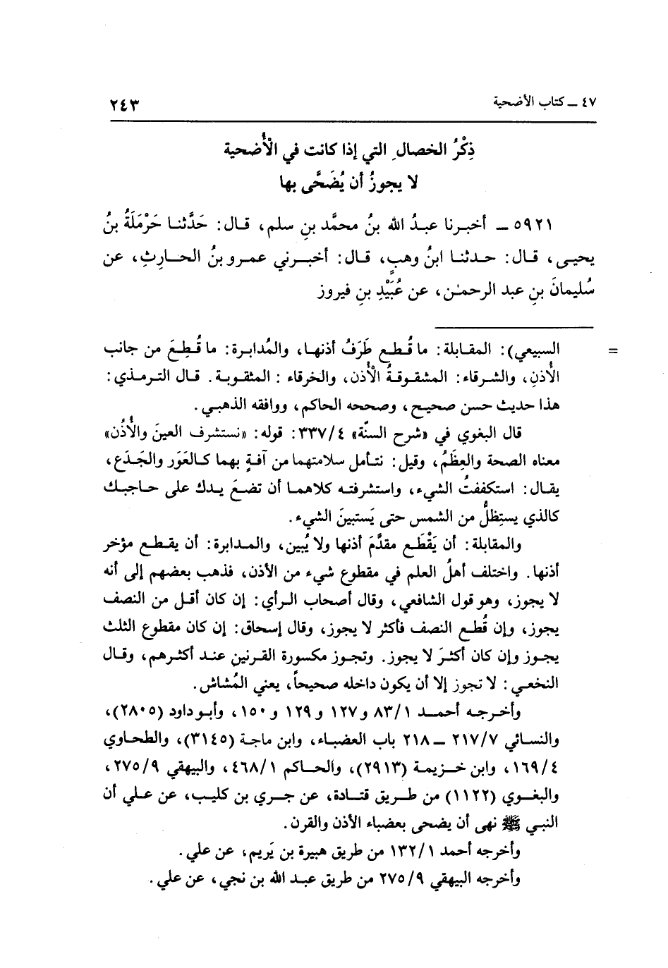 = السبيعي": المقابلة: ما قطق طرف أذنها من جانب الأذن، والشرقاء: المشقوقة الأذن، والخرقاء: المثقوبة. قال الترمذي: هذا حديث حسن صحيح، وصححه الحاكم، ووافقه الذهبي.