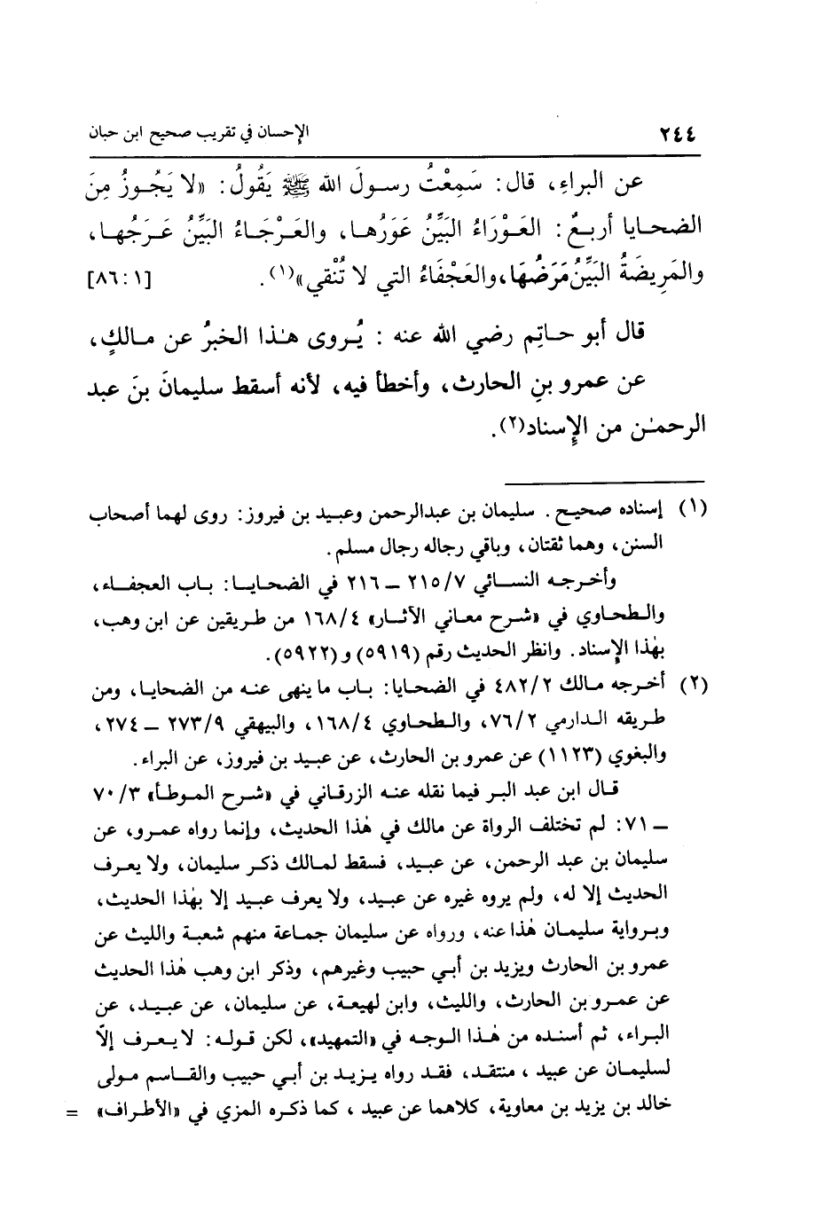 قال أبو حاتم رضى الله تعالى عَنْهُ: يُرْوَى هَذَا الْخَبَرُ عَنْ مَالِكٍ، عَنْ عَمْرِو بْنِ الْحَارِثِ، وَأَخْطَأَ فِيهِ، لِأَنَّهُ أَسْقَطَ سليمان بن عبد الرحمن من الإسناد2