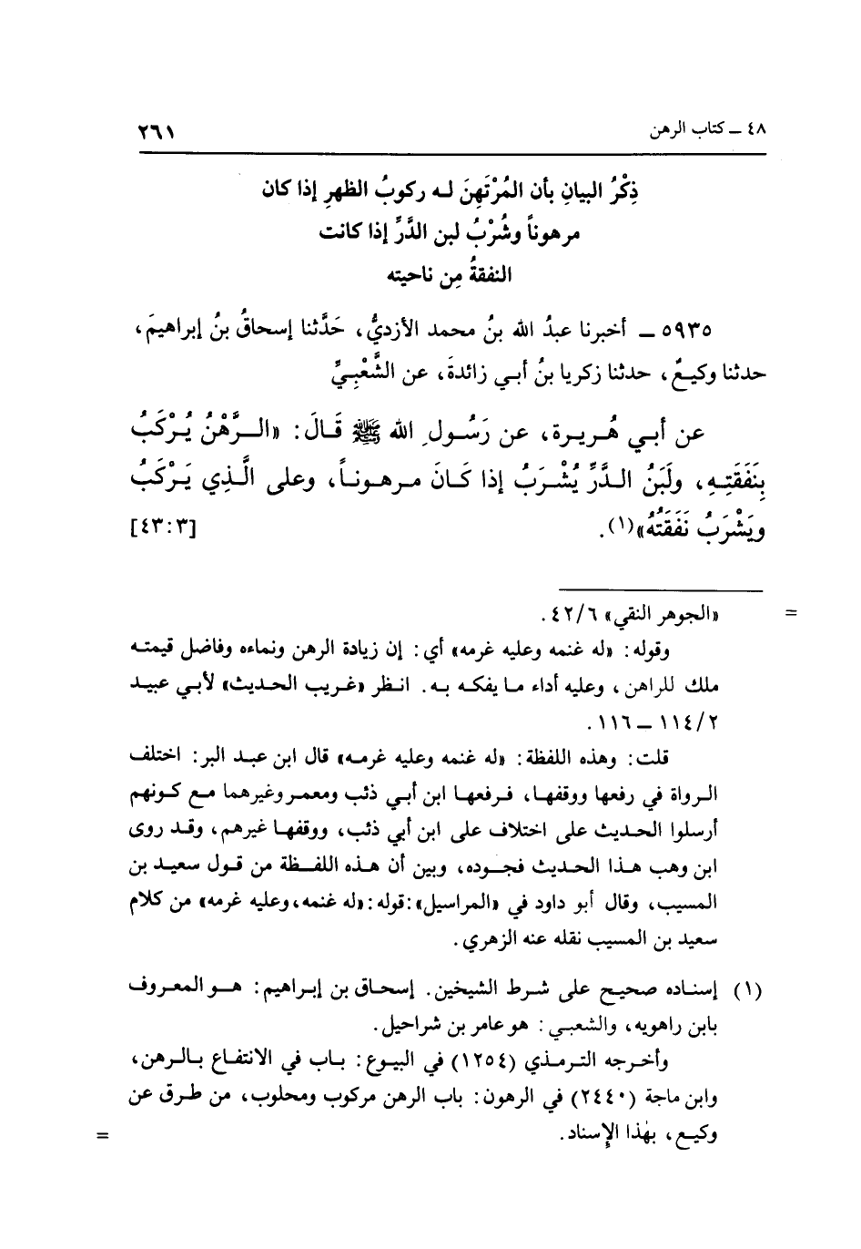عَنْ أَبِي هُرَيْرَةَ، عَنْ رَسُولِ اللَّهِ صَلَّى اللَّهُ عَلَيْهِ وَسَلَّمَ قَالَ: "الرَّهْنُ يُرْكَبُ بِنَفَقَتِهِ، وَلَبَنُ الدَّرِّ يُشْرَبُ إِذَا كَانَ مرهونا، وعلى الذي يركب ويشرب نفقته" 1 [43:3]
