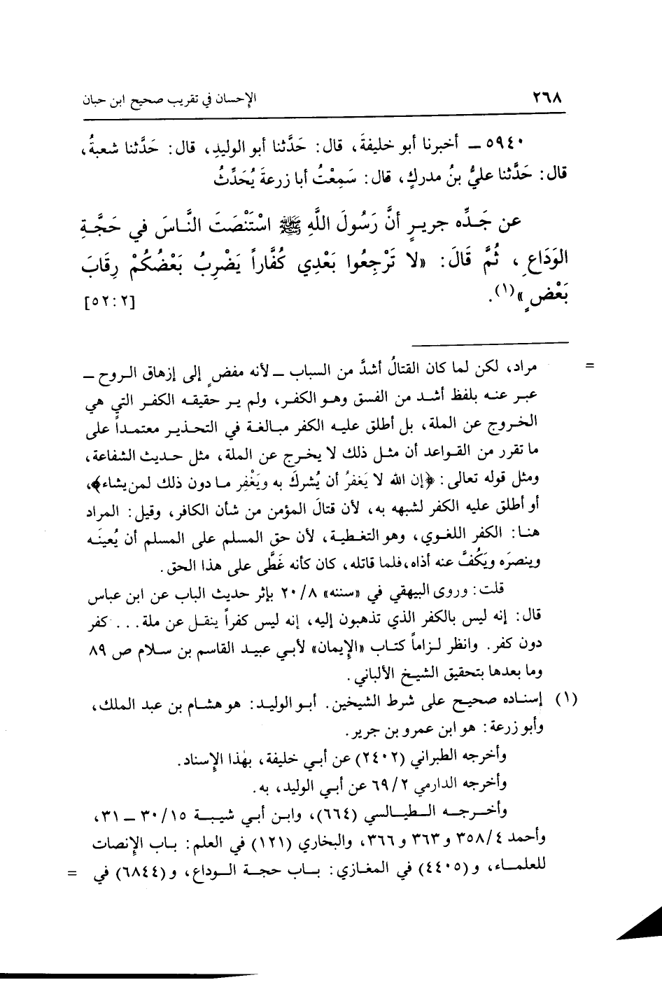 عَنْ جَدِّهِ جَرِيرٍ أَنَّ رَسُولَ اللَّهِ صَلَّى اللَّهُ عَلَيْهِ وَسَلَّمَ اسْتَنْصَتَ النَّاسَ فِي حَجَّةِ الْوَدَاعِ، ثُمَّ قَالَ: "لَا تَرْجِعُوا بَعْدِي كُفَّارًا يَضْرِبُ بَعْضُكُمْ رقاب بعض" 1 [52:2]