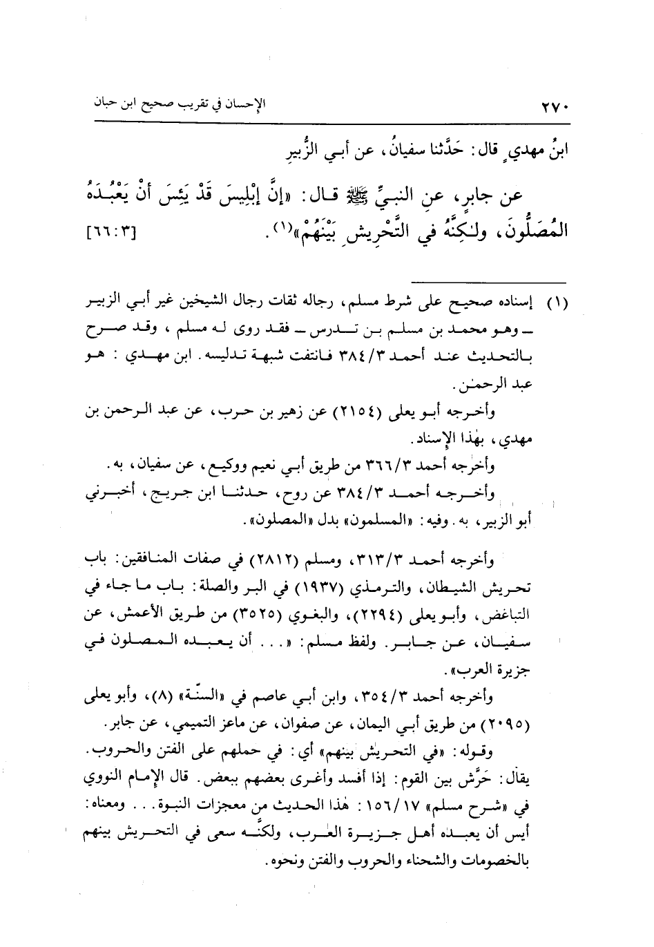 وأخرجه أحمد 3/313 في صفات المنافقين: باب تحريش الشيطان، والترمذي "1937" في البر والصلة: باب في التباغض، وأبو يعلى "2294"، والبغوي "3525" من طريق الأعمش، عن سفيان، عن جابر. ولفظ مسلم: " ... أن يعبده المصلون في جزيرة العرب".