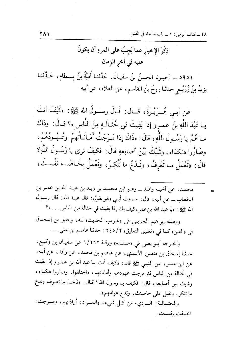 عَنْ أَبِي هُرَيْرَةَ، قَالَ: قَالَ رَسُولُ اللَّهِ صَلَّى اللَّهُ عَلَيْهِ وَسَلَّمَ: "كَيْفَ أَنْتَ يَا عَبْدَ اللَّهِ بْنَ عَمْرٍو إِذَا بَقِيتَ فِي حُثَالَةٍ مِنَ النَّاسِ"؟ قَالَ: وَذَاكَ مَا هُمْ يَا رَسُولَ اللَّهِ قَالَ: "ذَاكَ إِذَا مَرِجَتْ أَمَانَاتُهُمْ وعهودهم، وصاورا هَكَذَا"، وَشَبَّكَ بَيْنَ أَصَابِعِهِ قَالَ: فَكَيْفَ تَرَى يَا رَسُولَ اللَّهِ؟ قَالَ: تَعْمَلُ مَا تَعْرِفُ، وَتَدَعُ مَا تُنْكِرُ، وَتَعْمَلُ بِخَاصَّةِ نَفْسِكِ،