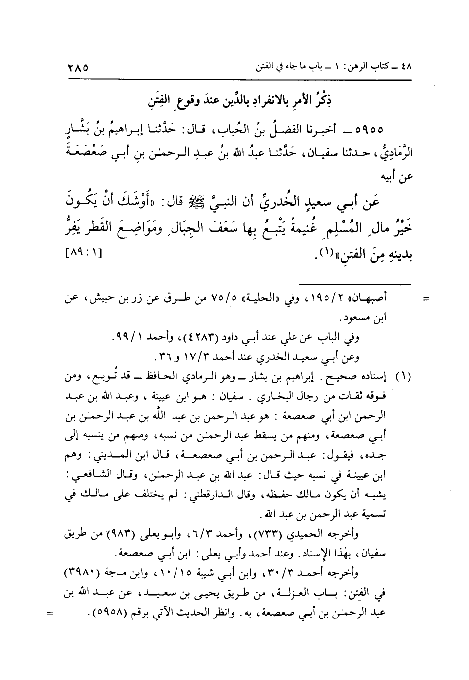5955 ـ أَخْبَرَنَا الْفَضْلُ بْنُ الْحُبَابِ، قَالَ: حَدَّثَنَا إِبْرَاهِيمُ بْنُ بَشَّارٍ الرَّمَادِيُّ، حَدَّثَنَا سُفْيَانُ، حَدَّثَنَا عَبْدِ اللَّهِ بْنِ عَبْدِ الرَّحْمَنِ بْنِ أَبِي صَعْصَعَةَ عَنْ أَبِيهِ