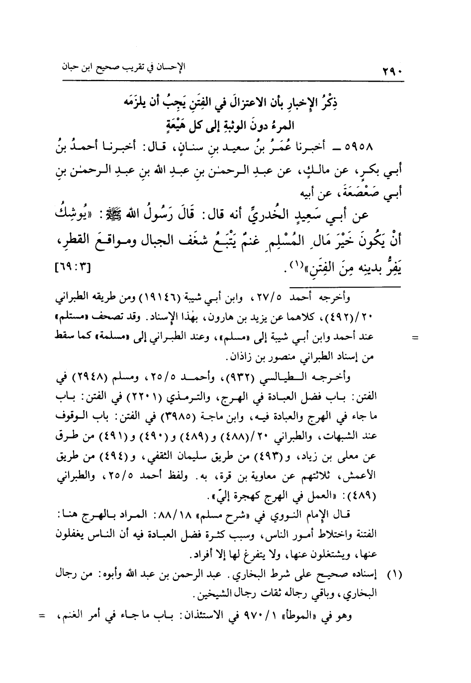عَنْ أَبِي سَعِيدٍ الْخُدْرِيِّ أَنَّهُ قَالَ: قَالَ رَسُولُ اللَّهِ صَلَّى اللَّهُ عَلَيْهِ وسلم: "يُوشِكُ أَنْ يَكُونَ خَيْرَ مَالِ الْمُسْلِمِ غَنَمٌ يَتْبَعُ شَغَفَ الْجِبَالِ وَمَوَاقِعَ الْقَطْرِ، يَفِرُّ بِدِينِهِ من الفتن" 1 [69:3]