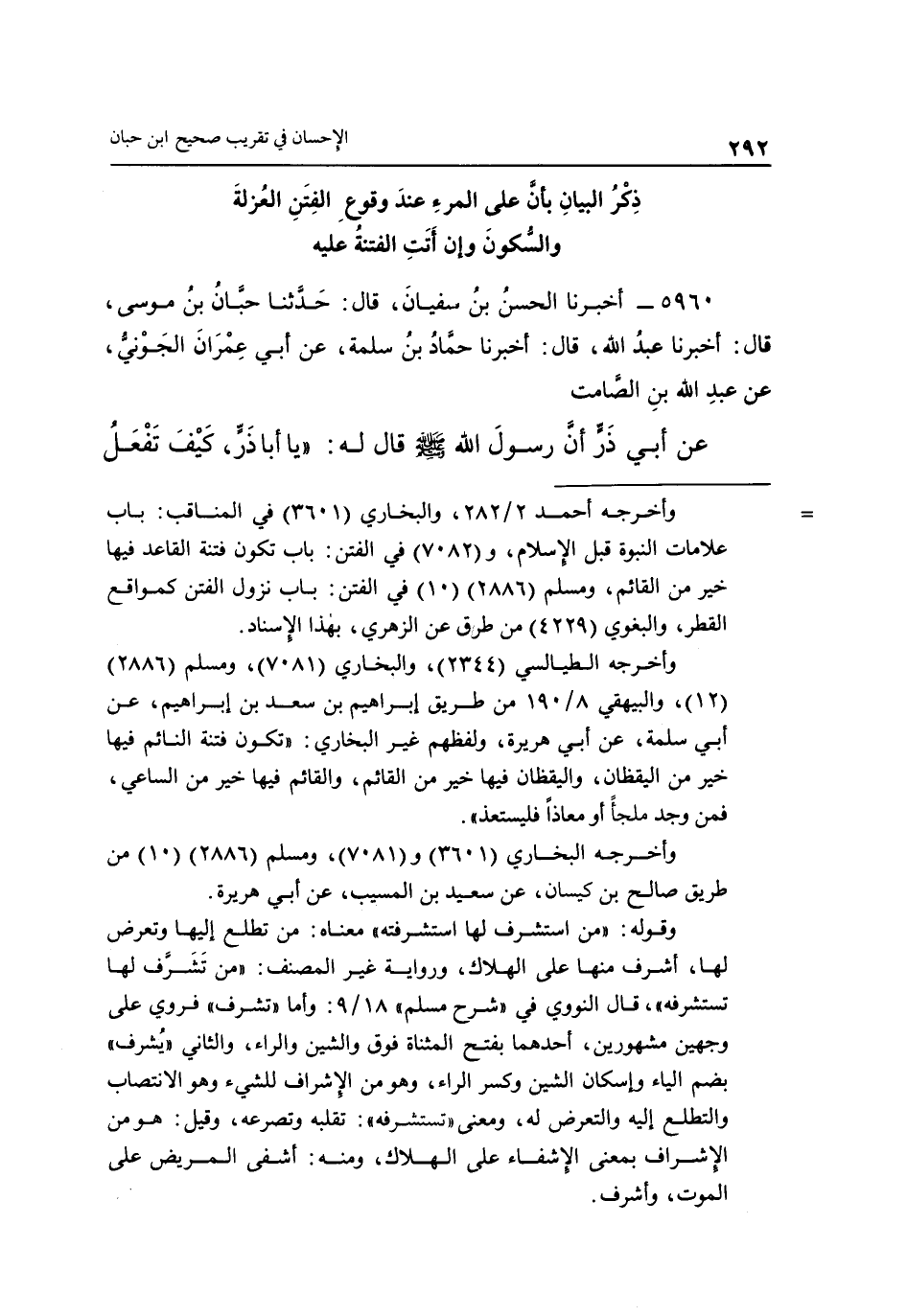 ذِكْرُ الْبَيَانِ بِأَنَّ عَلَى الْمَرْءِ عِنْدَ وُقُوعِ الْفِتَنِ الْعُزْلَةَ وَالسُّكُونَ وَإِنْ أَتَتِ الْفِتْنَةُ عَلَيْهِ