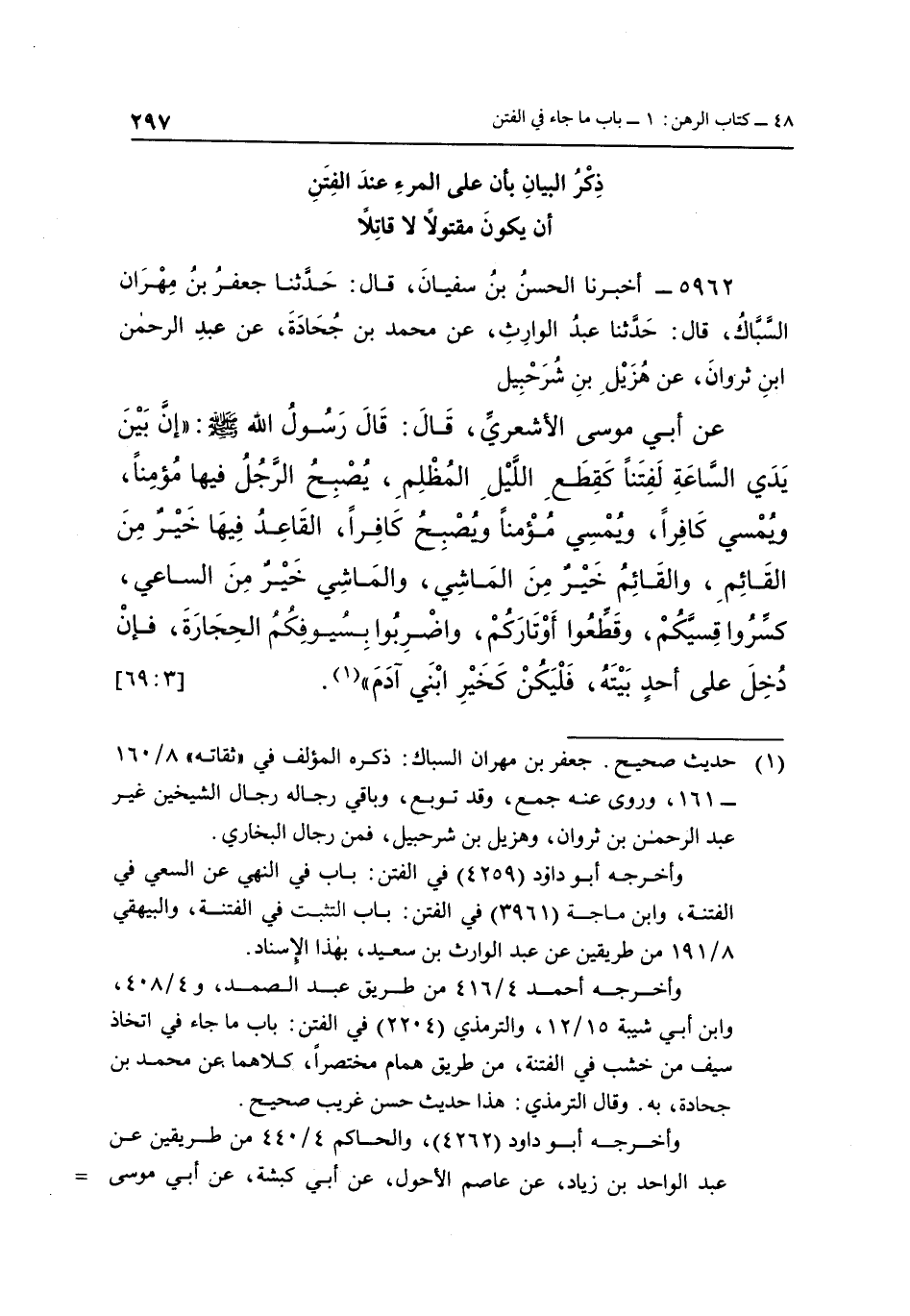 عَنْ أَبِي مُوسَى الْأَشْعَرِيِّ، قَالَ: قَالَ رَسُولُ اللَّهِ صَلَّى اللَّهُ عَلَيْهِ وَسَلَّمَ: "إِنَّ بَيْنَ يَدَيِ السَّاعَةِ لَفِتَنًا كقطع الليل المظلم، يصبح الرجل فيما مؤمنا ويمسى كافرا، ويسمى مُؤْمِنًا وَيُصْبِحُ كَافِرًا الْقَاعِدُ فِيهَا خَيْرٌ مِنَ الْقَائِمِ، وَالْقَائِمُ خَيْرٌ مِنَ الْمَاشِي، وَالْمَاشِي خَيْرٌ مِنَ السَّاعِي، كَسِّرُوا قِسِيَّكُمْ، وَقَطِّعُوا أَوْتَارَكُمْ، وَاضْرِبُوا بِسُيُوفِكُمُ الْحِجَارَةَ، فَإِنْ دُخِلَ عَلَى أَحَدٍ بَيْتَهُ فليكن كخير ابني آدم" 1 [69:3]