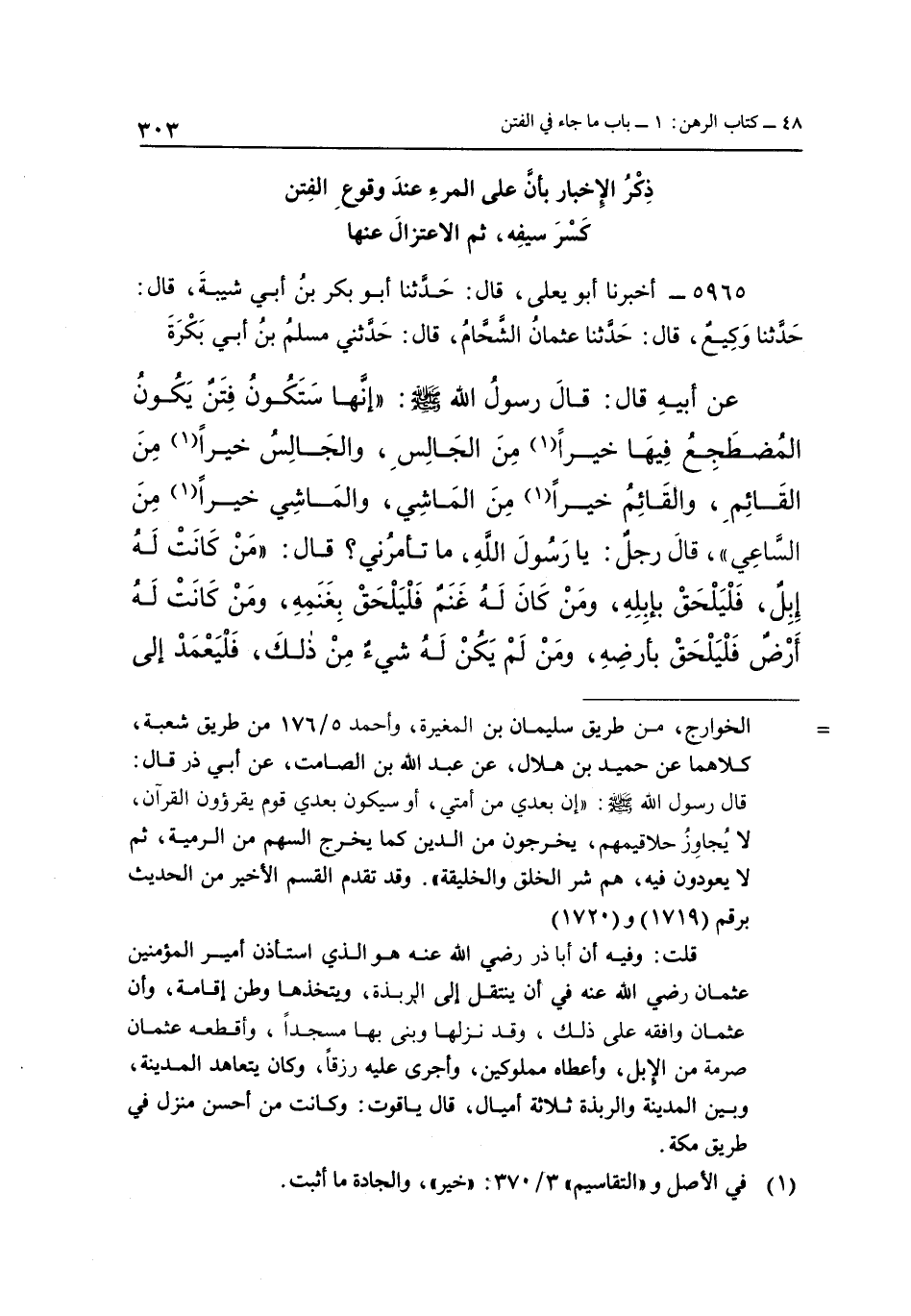 5965 - أَخْبَرَنَا أَبُو يَعْلَى، قَالَ: حَدَّثَنَا أَبُو بَكْرِ بْنُ أَبِي شَيْبَةَ، قَالَ: حَدَّثَنَا وَكِيعٌ، قَالَ: حَدَّثَنَا عُثْمَانُ الشَّحَّامُ، قَالَ حَدَّثَنِي مُسْلِمُ بْنُ أَبِي بَكْرَةَ، عَنْ أَبِيهِ، قَالَ: قَالَ رَسُولُ اللَّهِ صَلَّى اللَّهُ عَلَيْهِ وَسَلَّمَ: «إِنَّهَا §سَتَكُونُ فِتَنٌ يَكُونُ الْمُضْطَجِعُ فِيهَا خَيْرًا مِنَ الْجَالِسِ، وَالْجَالِسُ خَيْرًا مِنَ الْقَائِمِ، وَالْقَائِمُ خَيْرًا مِنَ الْمَاشِي، وَالْمَاشِي خَيْرًا مِنَ السَّاعِي»، قَالَ رَجُلٌ: يَا رَسُولَ اللَّهِ، مَا تَأْمُرُنِي؟ قَالَ: «مَنْ كَانَتْ لَهُ إِبِلٌ فَلْيَلْحَقْ بِإِبِلِهِ، وَمَنْ كَانَ لَهُ غَنَمٌ فَلْيَلْحَقْ بِغَنَمِهِ، وَمَنْ كَانَتْ لَهُ أَرْضٌ فَلْيَلْحَقْ بِأَرْضِهِ، وَمَنْ لَمْ يَكُنْ لَهُ شَيْءٌ مِنْ ذَلِكَ، فَلْيَعْمِدْ إِلَى -[304]- سَيْفِهِ، فَلْيَضْرِبْ بِحَدِّهِ عَلَى صَخْرَةٍ، ثُمَّ لِيَنْجُ إِنِ اسْتَطَاعَ النَّجَاةَ»