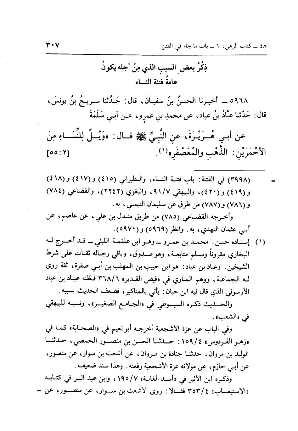 5968 ـ أَخْبَرَنَا الْحَسَنُ بْنُ سُفْيَانَ، قَالَ: حَدَّثَنَا سُرَيْجُ بْنُ يُونُسَ، قَالَ: حَدَّثَنَا عَبَّادُ بْنُ عَبَّادٍ، عَنْ مُحَمَّدِ بْنِ عَمْرٍو، عَنْ أَبِي سَلَمَةَ عَنْ أَبِي هُرَيْرَةَ، عَنِ النَّبِيِّ صَلَّى اللَّهُ عَلَيْهِ وَسَلَّمَ قَالَ: "وَيْلٌ للنساء من الأحمرين: الذهب والمعصفر" 1. [55:2]