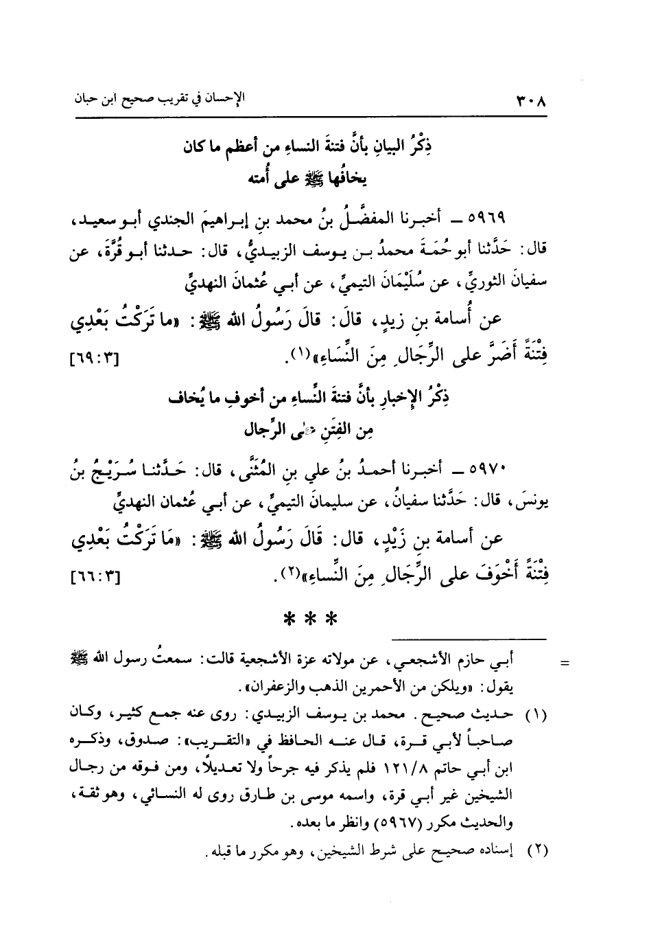 5970 ـ أَخْبَرَنَا أَحْمَدُ بْنُ عَلِيِّ بْنِ الْمُثَنَّى، قَالَ: حَدَّثَنَا سُرَيْجُ بْنُ يُونُسَ، قَالَ: حَدَّثَنَا سُفْيَانُ، عَنْ سُلَيْمَانَ، التَّيْمِيِّ عَنْ أَبِي عُثْمَانَ النَّهْدِيِّ عَنْ أُسَامَةَ بْنِ زَيْدٍ، قَالَ: قَالَ رَسُولُ اللَّهِ صَلَّى اللَّهُ عَلَيْهِ وَسَلَّمَ: "مَا تَرَكْتُ بَعْدِي فتنة اخوف على الرجال من النساء" 2. [66:3]