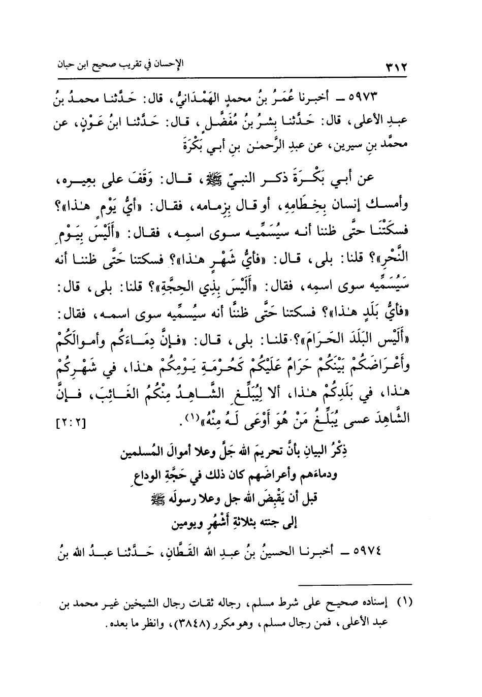 5973 ـ أَخْبَرَنَا عُمَرُ بْنُ مُحَمَّدٍ الْهَمَذَانِيُّ، قَالَ: حَدَّثَنَا مُحَمَّدُ بْنُ عَبْدِ الْأَعْلَى، قَالَ: حَدَّثَنَا بِشْرُ بْنُ مفضل، قال: حدثنا بن عَوْنٍ، عَنْ مُحَمَّدِ بْنِ سِيرِينَ، عَنْ عَبْدِ الرَّحْمَنِ بْنِ أَبِي بَكْرَةَ