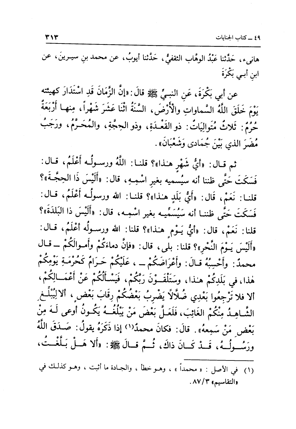 هَانِئٍ حَدَّثَنَا عَبْدُ الْوَهَّابِ الثَّقَفِيُّ حَدَّثَنَا أَيُّوبُ عن محمد بن سيرين عن بن أَبِي بَكْرَةَ عَنْ أَبِي بَكْرَةَ عَنِ النَّبِيِّ صَلَّى اللَّهُ عَلَيْهِ وَسَلَّمَ قَالَ إِنَّ الزَّمَانَ قَدِ اسْتَدَارَ كَهَيْئَتِهِ يَوْمَ خَلَقَ اللَّهُ السَّمَاوَاتِ والأرض السنة اثنا عشرة شَهْرًا مِنْهَا أَرْبَعَةٌ حُرُمٌ ثَلَاثٌ مُتَوَالِيَاتٌ ذُو الْقَعْدَةِ وَذُو الْحِجَّةِ وَالْمُحَرَّمُ وَرَجَبُ مُضَرَ الَّذِي بَيْنَ جُمَادَى وَشَعْبَانَ ثُمَّ قَالَ أَيُّ شَهْرٍ هَذَا قُلْنَا اللَّهُ وَرَسُولُهُ أَعْلَمُ قَالَ فَسَكَتَ حَتَّى ظَنَنَّا أَنَّهُ سَيُسَمِّيهِ بِغَيْرِ اسْمِهِ قَالَ أَلَيْسَ ذَا الْحِجَّةِ قُلْنَا نَعَمْ قَالَ أَيُّ بَلَدٍ هَذَا قُلْنَا اللَّهُ وَرَسُولُهُ أَعْلَمُ قَالَ فَسَكَتَ حَتَّى ظَنَنَّا أَنَّهُ سَيُسَمِّيهِ بِغَيْرِ اسْمِهِ قَالَ أَلَيْسَ ذَا الْبَلْدَةَ قُلْنَا نَعَمْ قَالَ أَيُّ يَوْمٍ هَذَا قُلْنَا اللَّهُ وَرَسُولُهُ أَعْلَمُ قَالَ أَلَيْسَ يَوْمَ النَّحْرِ قُلْنَا بَلَى قَالَ فَإِنَّ دِمَاءَكُمْ وَأَمْوَالَكُمْ قَالَ مُحَمَّدٌ وَأَحْسِبُهُ قَالَ وَأَعْرَاضَكُمْ عَلَيْكُمْ حَرَامٌ كَحُرْمَةِ يَوْمِكُمْ هَذَا فِي بَلَدِكُمْ هَذَا وَسَتَلْقَوْنَ رَبَّكُمْ فَيَسْأَلُكُمْ عَنْ أَعْمَالِكُمْ أَلَا فَلَا تَرْجِعُوا بَعْدِي ضُلَّالًا يَضْرِبُ بَعْضُكُمْ رِقَابَ بَعْضٍ أَلَا لِيُبَلِّغِ الشَّاهِدُ مِنْكُمُ الْغَائِبَ فَلَعَلَّ بَعْضَ مَنْ يَبْلُغُهُ يَكُونُ أَوْعَى لَهُ مِنْ بَعْضِ مَنْ سَمِعَهُ قَالَ فَكَانَ مُحَمَّدٌ1 إِذَا ذَكَرَهُ يَقُولُ صَدَقَ اللَّهُ وَرَسُولُهُ قَدْ كَانَ ذَاكَ ثُمَّ قَالَ صَلَّى اللَّهُ عَلَيْهِ وسلم "الا هل بلغت