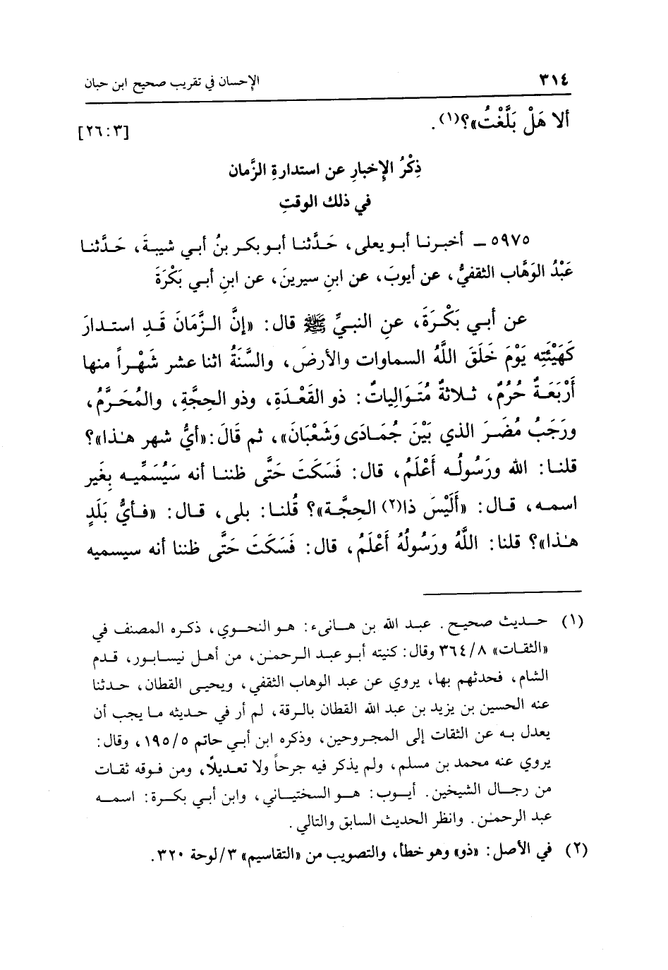 عَنْ أَبِي بَكْرَةَ، عَنِ النَّبِيِّ صَلَّى اللَّهُ عَلَيْهِ وَسَلَّمَ قَالَ: "إِنَّ الزَّمَانَ قَدِ اسْتَدَارَ كَهَيْئَتِهِ يَوْمَ خَلَقَ اللَّهُ السَّمَاوَاتِ وَالْأَرْضَ، وَالسُّنَّةُ اثْنَا عَشَرَ شَهْرًا مِنْهَا أَرْبَعَةٌ حُرُمٌ، ثَلَاثَةٌ مُتَوَالِيَاتٌ: ذُو الْقَعْدَةِ، وَذُو الْحِجَّةِ، وَالْمُحَرَّمُ، وَرَجَبُ مُضَرَ الَّذِي بَيْنَ جُمَادَى وَشَعْبَانَ"، ثُمَّ قَالَ: "أَيُّ شَهْرٍ هَذَا"؟ قُلْنَا: اللَّهُ وَرَسُولُهُ أَعْلَمُ، قَالَ: فَسَكَتَ حَتَّى ظَنَنَّا أَنَّهُ سَيُسَمِّيهِ بِغَيْرِ اسْمِهِ، قَالَ: "أَلَيْسَ ذَا2 الْحِجَّةِ"؟ قُلْنَا: بَلَى، قَالَ: "فَأَيُّ بَلَدٍ هَذَا"؟ قُلْنَا: اللَّهُ وَرَسُولُهُ أَعْلَمُ، قَالَ: فَسَكَتَ حَتَّى ظَنَنَّا انه سيسميه