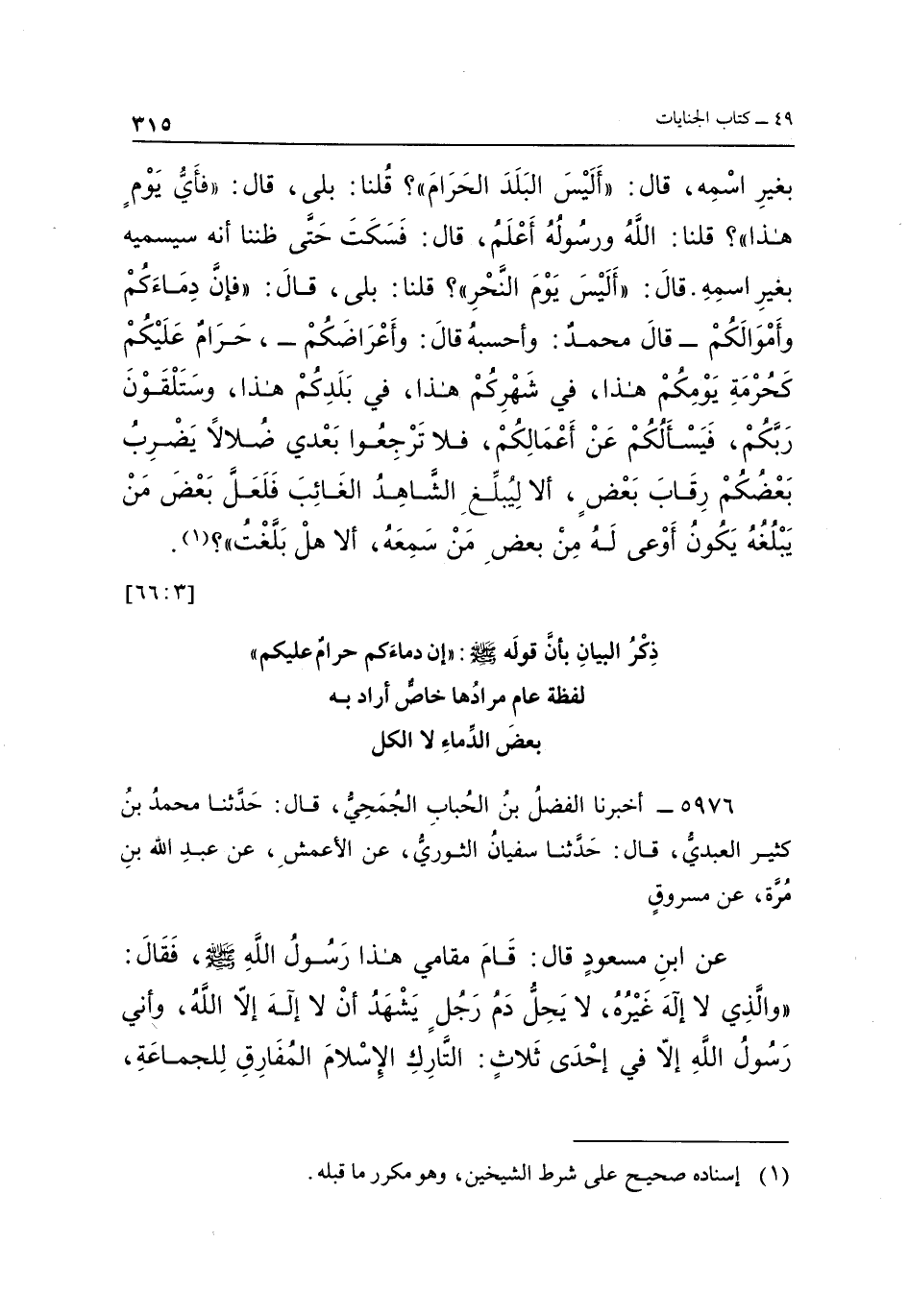 عن بن مَسْعُودٍ قَالَ: قَامَ مَقَامِي هَذَا رَسُولُ اللَّهِ صَلَّى اللَّهُ عَلَيْهِ وَسَلَّمَ، فَقَالَ: "وَالَّذِي لَا إِلَهَ غَيْرُهُ، لَا يَحِلُّ دَمُ رَجُلٍ يَشْهَدُ أَنْ لَا إِلَهَ إِلَّا اللَّهُ، وَأَنِّي رَسُولُ اللَّهِ إِلَّا فِي إِحْدَى ثَلَاثٍ: التَّارِكُ الْإِسْلَامَ المفارق للجماعة،