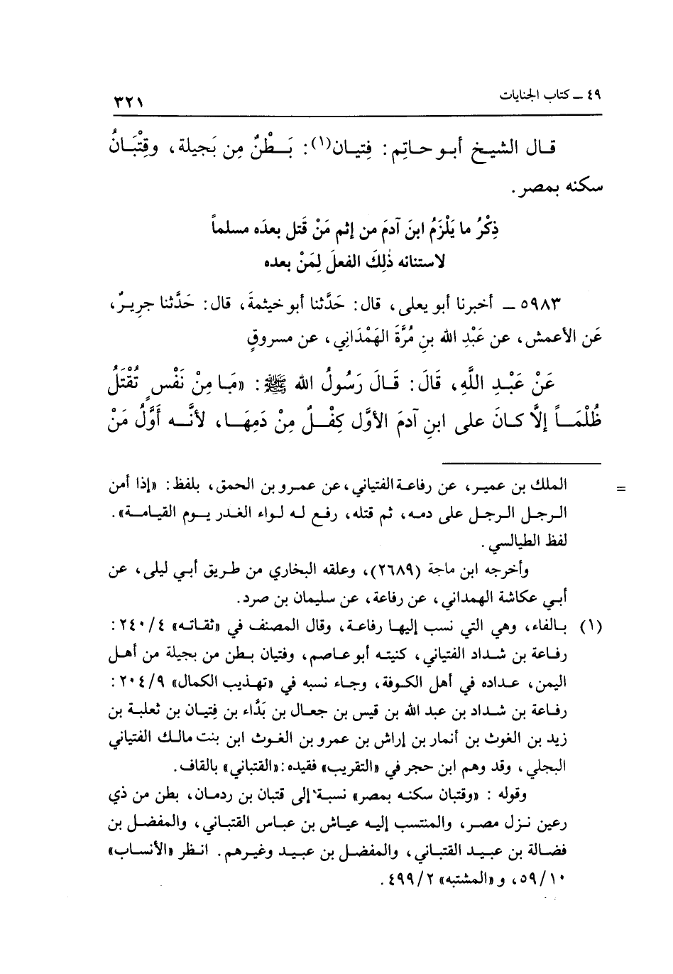 عَنْ عَبْدِ اللَّهِ، قَالَ: قَالَ رَسُولُ اللَّهِ صَلَّى اللَّهُ عَلَيْهِ وَسَلَّمَ: "مَا مِنْ نَفْسٍ تُقْتَلُ ظُلْمًا إِلَّا كان على بن آدَمَ الْأَوَّلِ كِفْلٌ مِنْ دَمِهَا لِأَنَّهُ أَوَّلُ