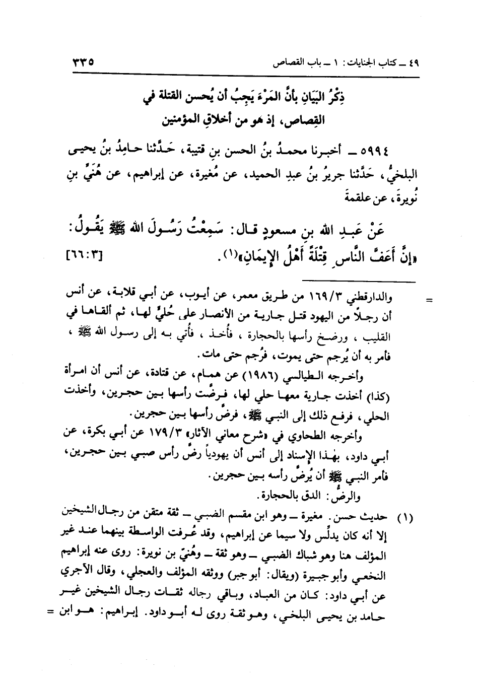 عَنْ عَبْدِ اللَّهِ بْنِ مَسْعُودٍ قَالَ: سَمِعْتُ رَسُولَ اللَّهِ صَلَّى اللَّهُ عَلَيْهِ وَسَلَّمَ يَقُولُ: "إِنَّ اعف الناس قتله أهل الإيمان" 1 [66:3]
