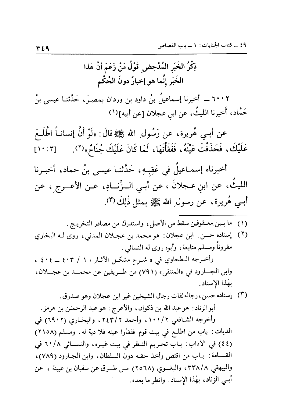 في الديات: باب من اطلع في بيت قوم ففقأوا عينه فلا دية له، ومسلم "2158" "44" في الآداب: باب تحريم النظر في بيت غيره، والنسائي 8/61 في القسامة: باب من اقتص وأخذ حقه دون السلطان، وابن الجارود "789"، والبيهقي 8/338، والبغوي "2568" من طرق عن سفيان بن عيينة، عن أبي الزناد، بهذا الإسناد. وانظر ما بعده.