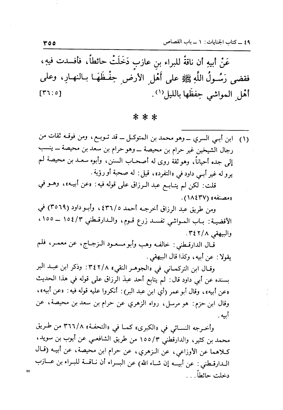 عَنْ أَبِيهِ أَنَّ نَاقَةً لِلْبَرَاءِ بْنِ عَازِبٍ دَخَلَتْ حَائِطًا، فَأَفْسَدَتْ فِيهِ، فَقَضَى رَسُولُ اللَّهِ صَلَّى اللَّهُ عَلَيْهِ وَسَلَّمَ عَلَى أَهْلِ الْأَرْضِ حَفِظَهَا بِالنَّهَارِ، وَعَلَى أَهْلِ الْمَوَاشِي حِفْظَهَا بِاللَّيْلِ1 [36:5]