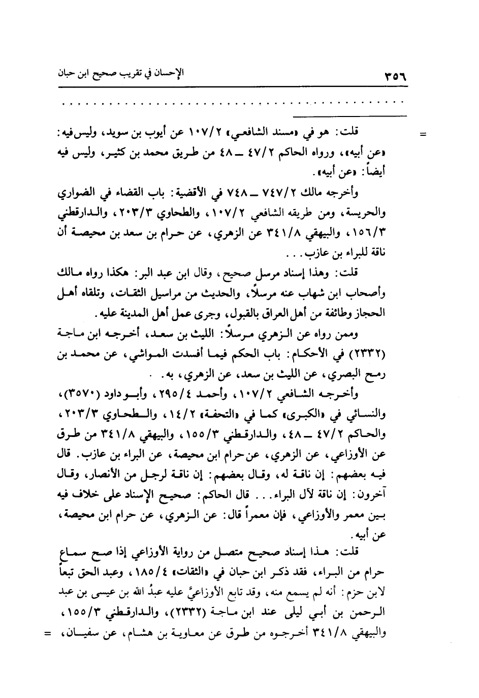 قلت: هو في "مسند الشافعي" 2/107 عن أيوب بن سويد، وليس فيه: "عن أبيه"، ورواه الحاكم 2/47 – 48 من طريق محمد بن كثير، وليس فيه أيضا: "عن أبيه" وأخرجه مالك 2/747 – 748 في الأقضية: باب القضاء في الضواري والحريسة، ومن طريقه الشافعي 2/107، والطحاوي 3/203، والدارقطني 3/156، والبيهقي 8/341 عن الزهري، عن حرام بن سعد بن محيصة أن ناقة للبراء بن عازم ...