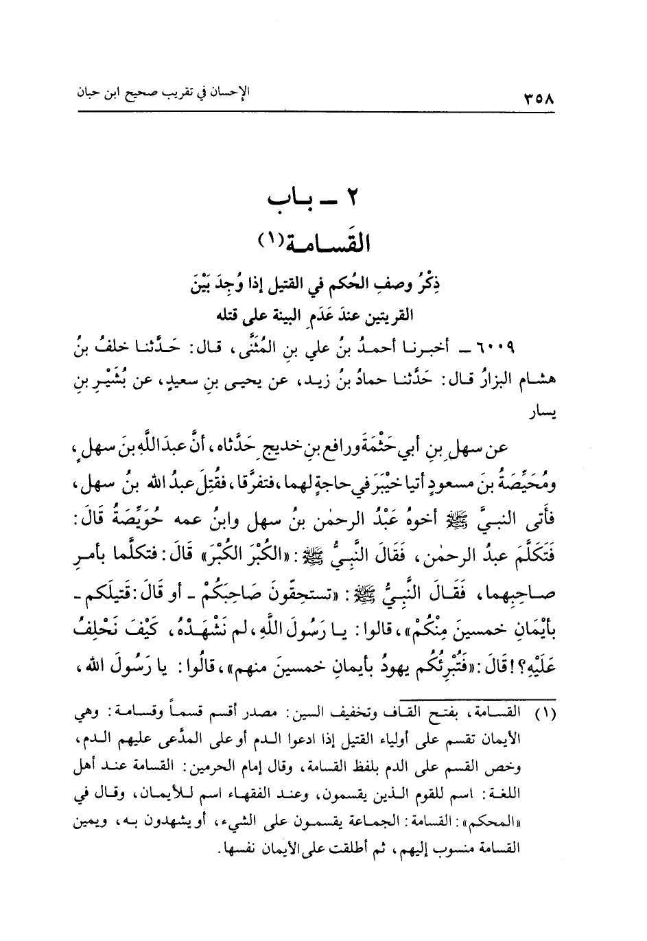 عَنْ سَهْلِ بْنِ أَبِي حَثْمَةَ وَرَافِعِ بْنِ خَدِيجٍ حدثاه، ان عبد الله بن سهل، ومحصية بْنَ مَسْعُودٍ أَتَيَا خَيْبَرَ فِي حَاجَةٍ لَهُمَا، فَتَفَرَّقَا، فَقُتِلَ عَبْدُ اللَّهِ بْنُ سَهْلٍ، فَأَتَى النَّبِيَّ صَلَّى اللَّهُ عَلَيْهِ وَسَلَّمَ أَخُوهُ عَبْدُ الرَّحْمَنِ بْنُ سَهْلٍ وَابْنُ عَمِّهِ حُوَيِّصَةُ قَالَ: فَتَكَلَّمَ عَبْدُ الرَّحْمَنِ، فَقَالَ النَّبِيُّ صَلَّى اللَّهُ عَلَيْهِ وَسَلَّمَ: "الْكُبْرَ الْكُبْرَ" قَالَ: فَتَكَلَّمَا بِأَمْرِ صَاحِبِهِمَا، فَقَالَ النَّبِيُّ صَلَّى اللَّهُ عَلَيْهِ وَسَلَّمَ: "تَسْتَحِقُّونَ صَاحِبَكُمْ ـ أَوْ قَالَ: قَتِيلَكُمْ ـ بِأَيْمَانِ خَمْسِينَ مِنْكُمْ"، قَالُوا: يَا رَسُولَ اللَّهِ، لَمْ نَشْهَدْهُ، كَيْفَ نَحْلِفُ عَلَيْهِ؟! قَالَ: "فَتُبْرِئُكُمْ يَهُودُ بِأَيْمَانِ خمسين منهم"، قالوا: يا رسول الله،