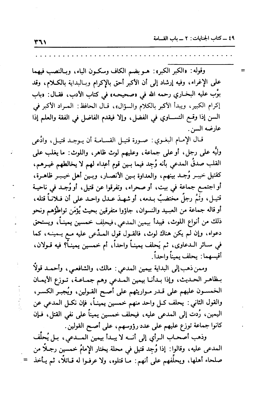 قال الإمام البغوي: صورة قتيل القسامة أن يوجد قتيل، واذعى وليَّه على رجل أو على جماعة، وعليهم لوث ظاهر، واللوث: ما يغلب على القلب صدق المدعي بأنه وجد فيما بين قوم أعداء لهم لا يحالطهم غيرهم، كقتيل، وثم رجل مختضب بدمه، أو شهد عدل واحد على أن فلانا قتله، أو قاله جماعة من العبيد والنسوان، جاؤوا متفرقين بحيث يؤمن تواطؤهم ونحو ذلك من أنواع اللوث، فيبدأ بيمين المدعي، فيحلف خمسين يمينا، ويستحق دعواه، وإن لم يكن هناك لوث، فالقول قول المدعي، عليه مع يمينه، كما في سائر الدعاوي، ثم يحلف يمينا واحد، أم خمسين يمينا؟ فيه قولان، أقيسهما: يحلف يمينا واحداً