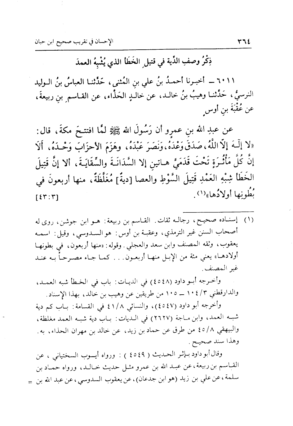عَنْ عَبْدِ اللَّهِ بْنِ عَمْرٍو أَنَّ رَسُولَ اللَّهِ صَلَّى اللَّهُ عَلَيْهِ وَسَلَّمَ لَمَّا افْتَتَحَ مَكَّةَ، قَالَ: "لَا إِلَهَ إِلَّا اللَّهُ، صَدَقَ وَعْدَهُ، وَنَصَرَ عَبْدَهُ، وَهَزَمَ الْأَحْزَابَ وَحْدَهُ، أَلَا إِنَّ كُلَّ مَأْثُرَةٍ تَحْتَ قَدَمَيَّ هَاتَيْنِ إِلَّا السِّدَانَةَ وَالسِّقَايَةَ، أَلَا إِنَّ قَتِيلَ الْخَطَإِ شِبْهِ الْعَمْدِ قَتِيلَ السَّوْطِ وَالْعَصَا [دِيَةٌ] مغلطة، منها أربعون في بطونها أولادها" 1. [43:3]